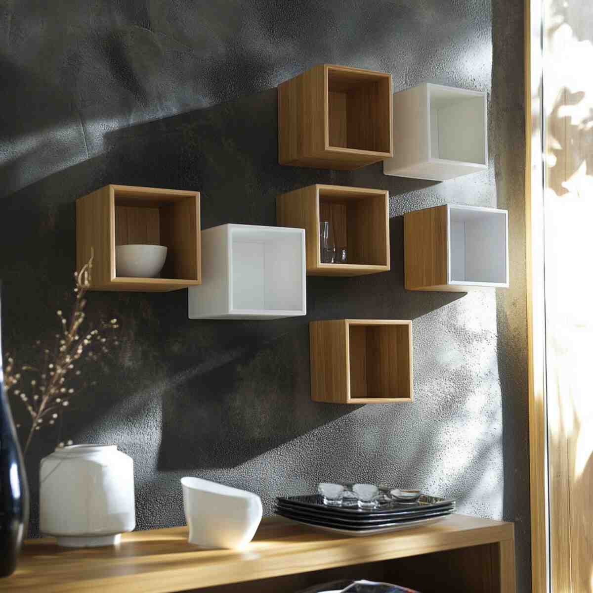 Wall-mounted cube units lift clutter off the floor, giving you more walking space in tight rooms.