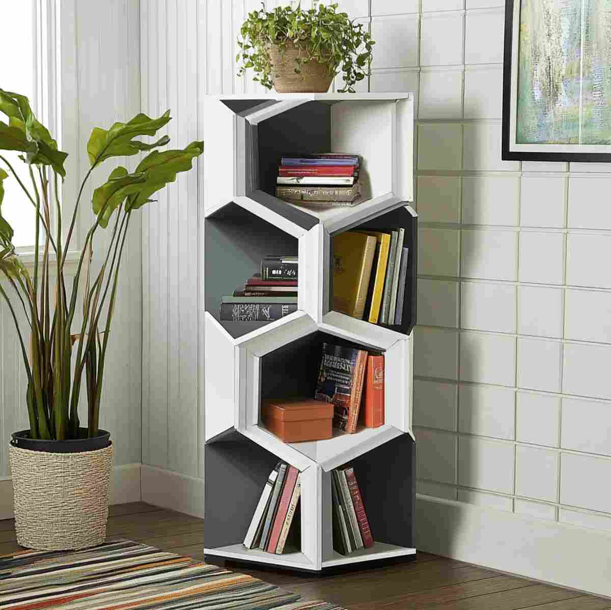 A rotating cube storage tower uses a tiny footprint but offers 360-degree access to your items.