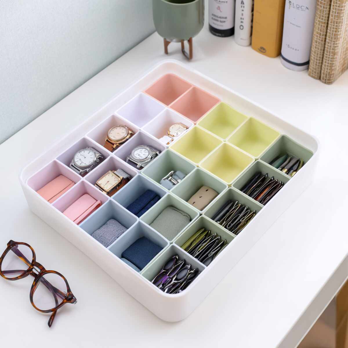 Stackable cubes allow vertical layering inside large drawers or shelves. You can assign each cube to a specific category for easy sorting.