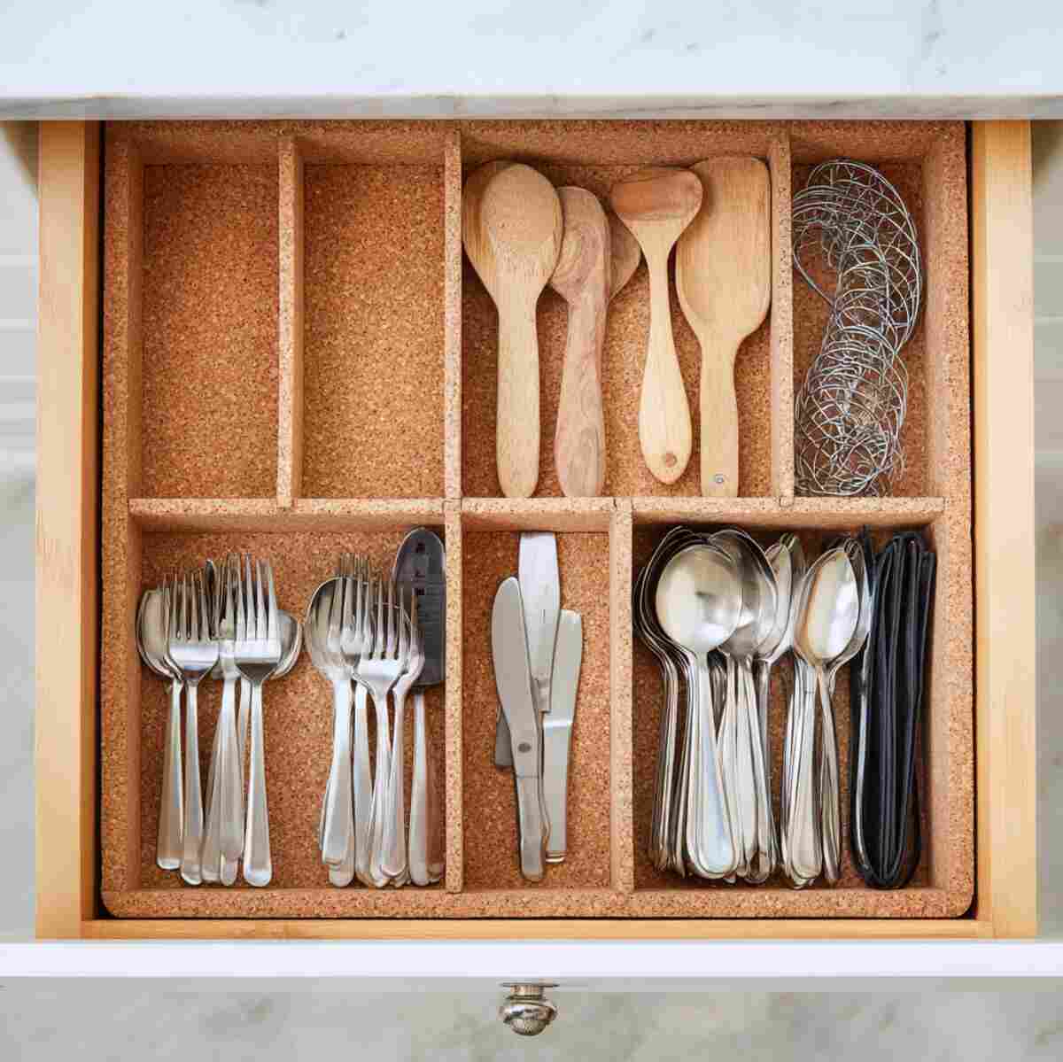 Cork-lined trays prevent utensils from slipping and reduce noise when opening drawers.