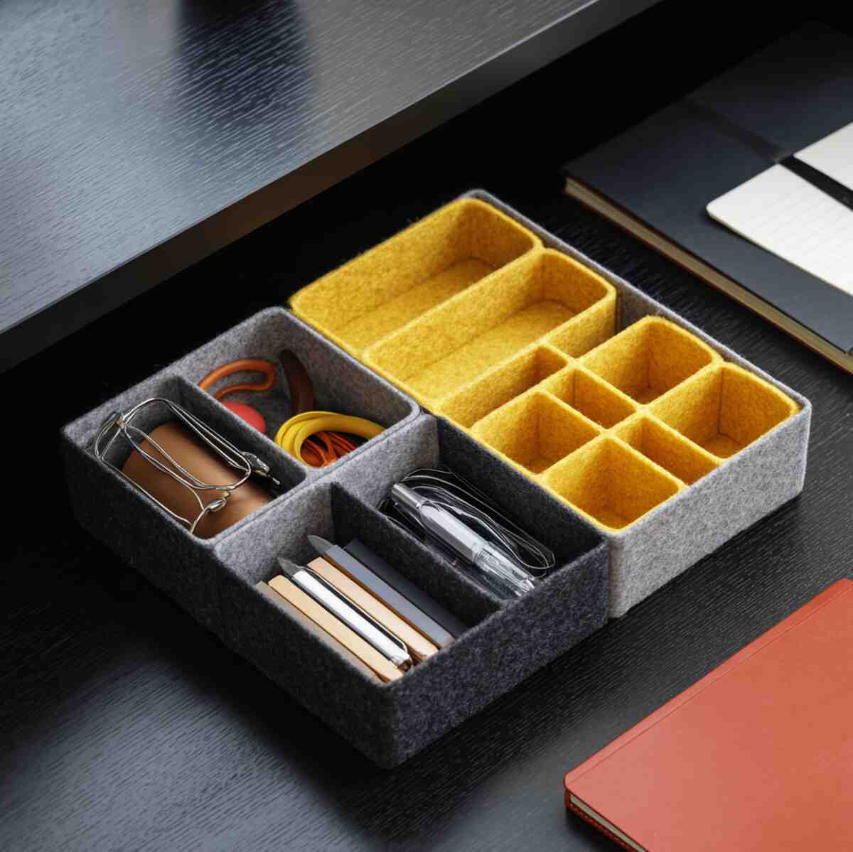 Felt trays are soft, silent, and ideal for pens, clips, or small gadgets. Their modular design lets you arrange them in any configuration to suit your desk drawer.