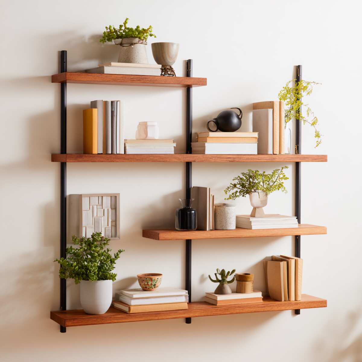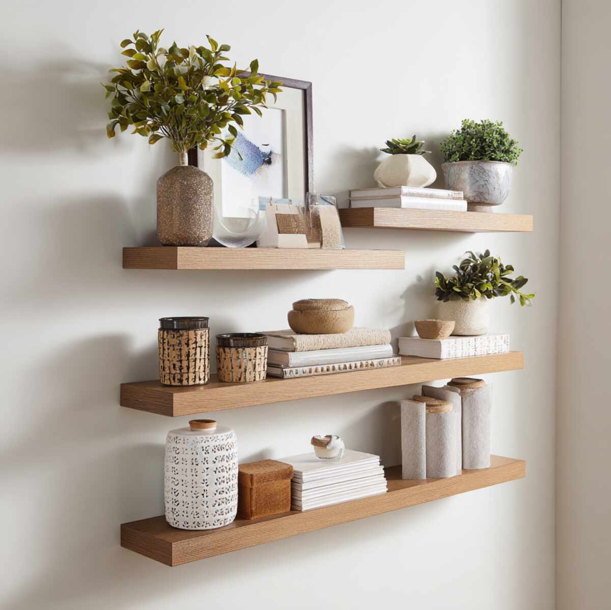 Floating wooden shelves are a timeless option that fit into almost any room. With a clean look and multiple layers, they let you stack books, plants, or décor in a neat vertical display.