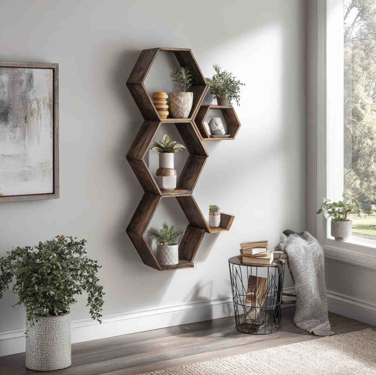 Honeycomb shelves with multiple tiers offer both artistic charm and functionality. Their geometric layout makes them ideal for creating a wall centerpiece while still holding plenty of items.