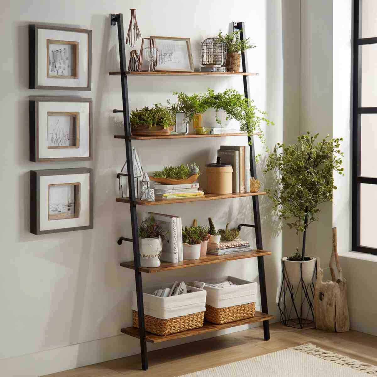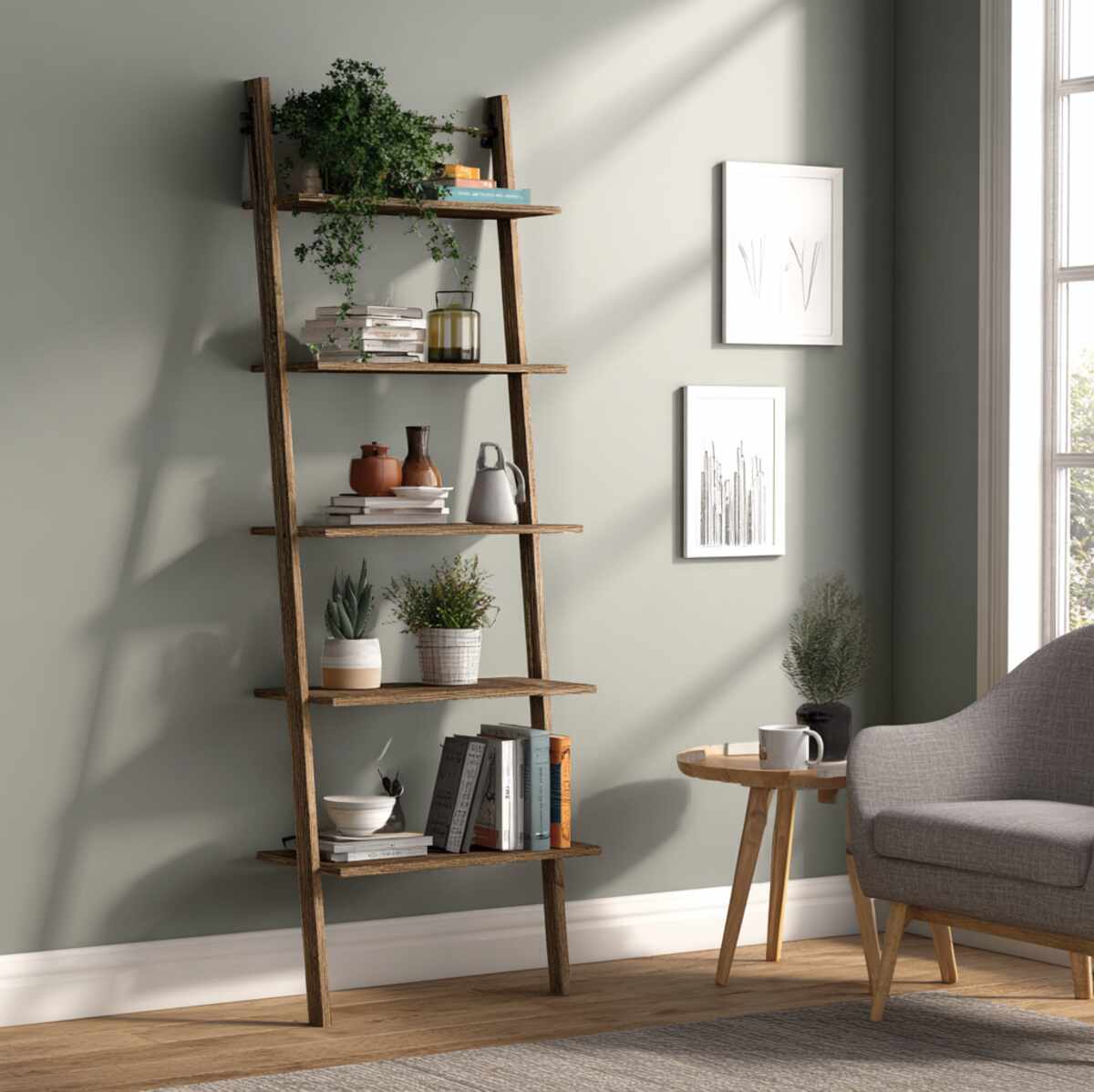Ladder-style wall shelves bring a casual yet stylish touch to any room. With multiple tiers that widen as they go down, they’re great for mixing décor with everyday items.