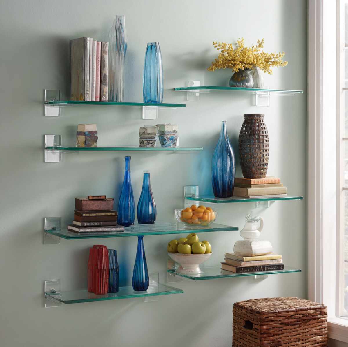 Choosing glass as part of your multi-tier wall shelf ideas makes rooms feel open while still providing solid storage.
