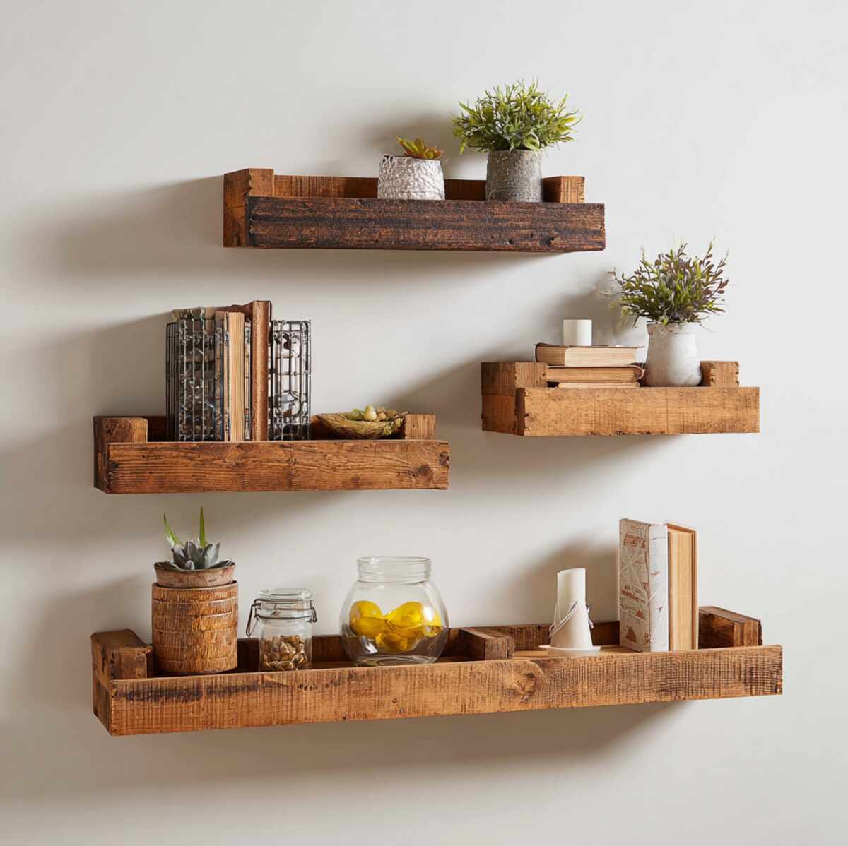 Rustic shelves made from reclaimed wood bring warmth and character to walls.
