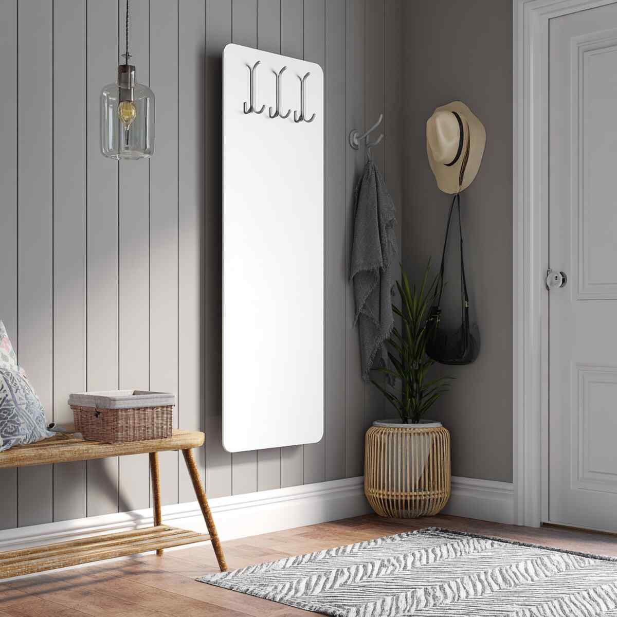 A mirror paired with hooks offers both reflection and organization in a tight hallway.
