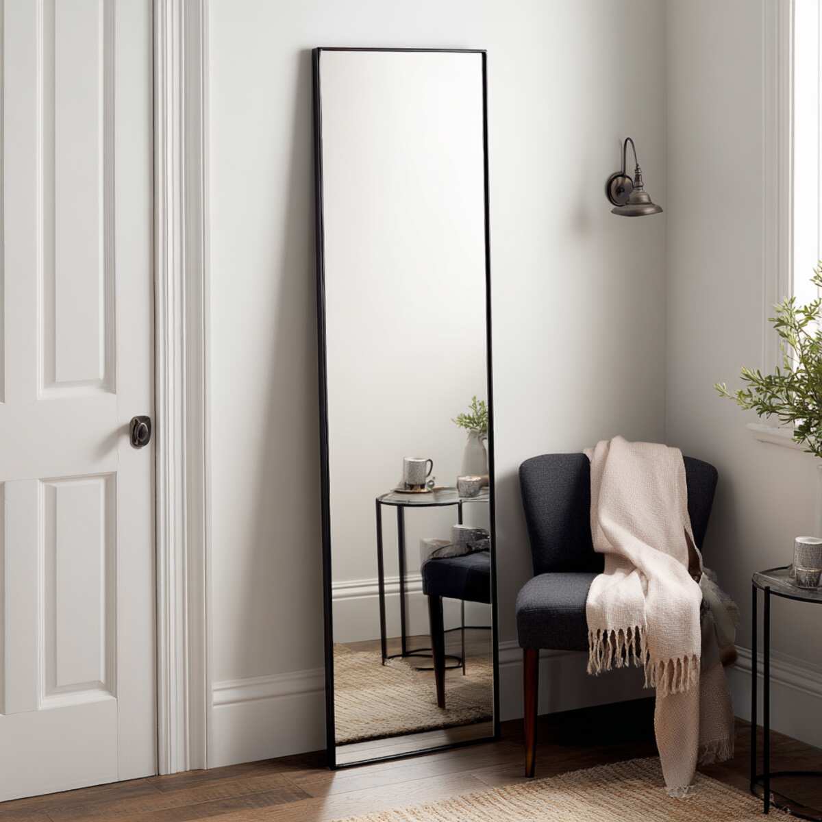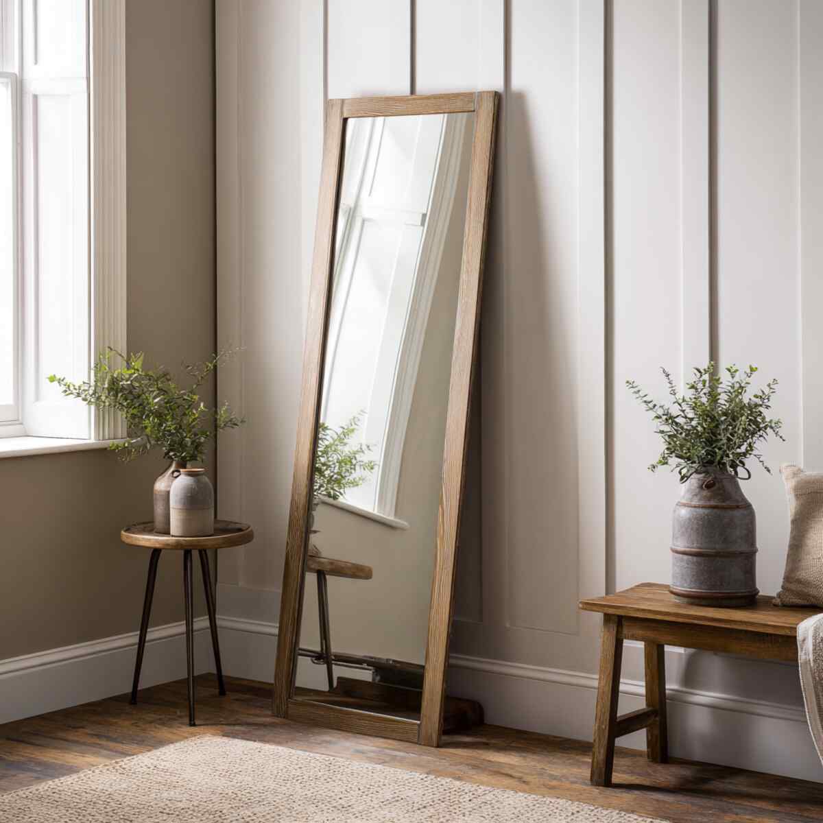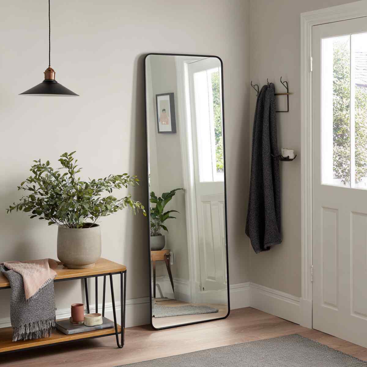 A leaning full-length mirror gives a relaxed, stylish feel while still working in a small hallway.