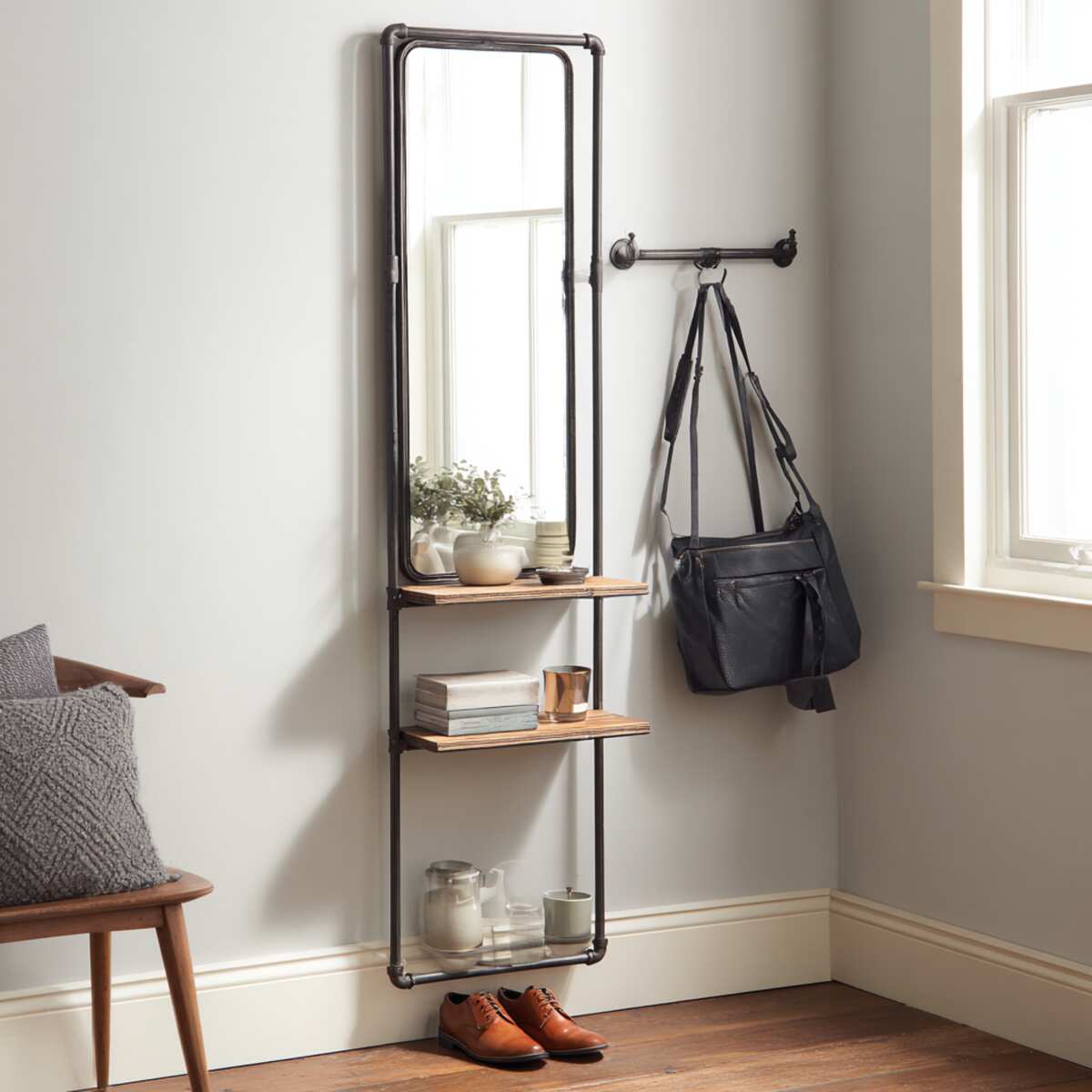 A pipe-frame mirror brings an edgy industrial look without taking up much space.