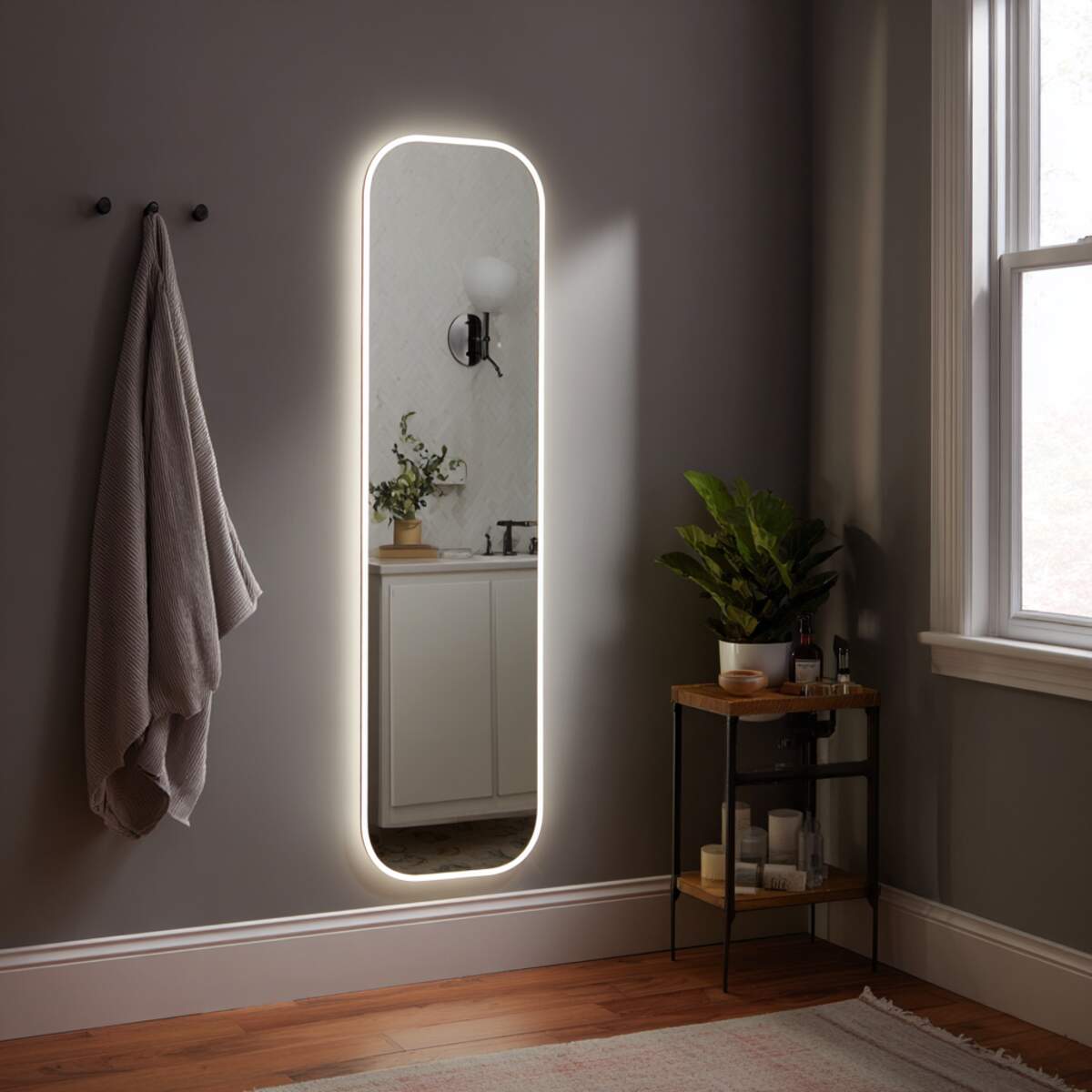 An LED-backlit mirror provides soft lighting that brightens a narrow hallway without needing extra fixtures. The slim design keeps it modern and space-efficient.