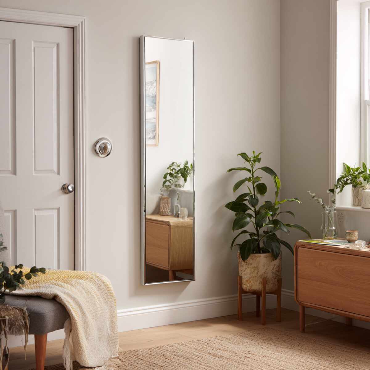Mounting a narrow mirror on a hallway door saves wall space completely. It gives you full functionality without blocking the walkway.