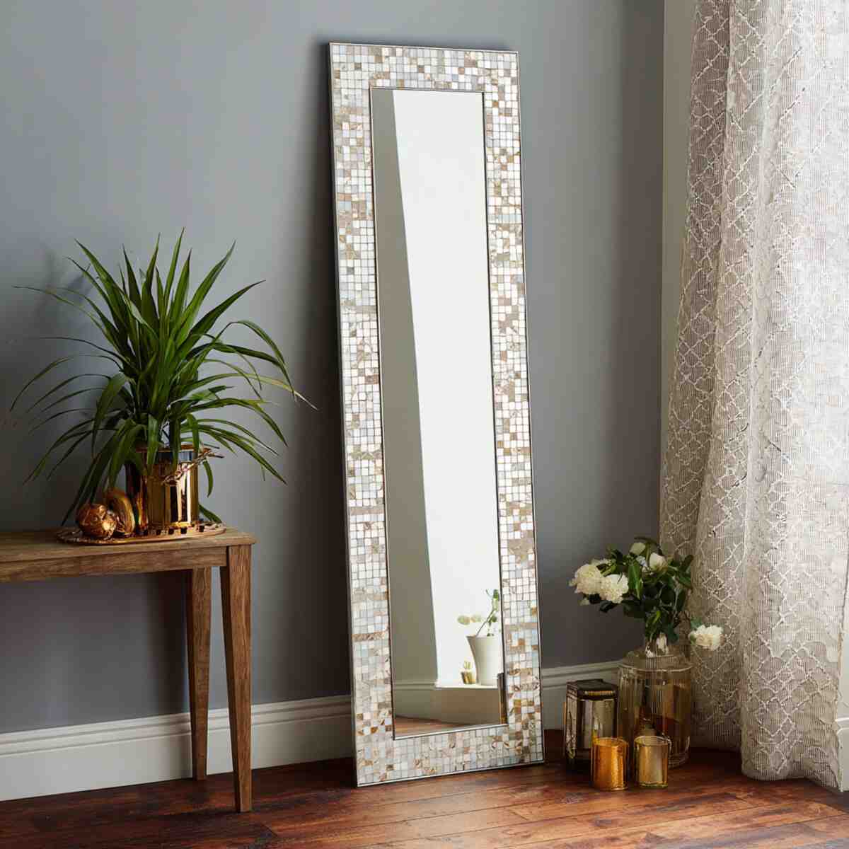 A mosaic border brings color and personality to a narrow hallway while keeping the mirror itself slim. It adds decorative flair without crowding the space.