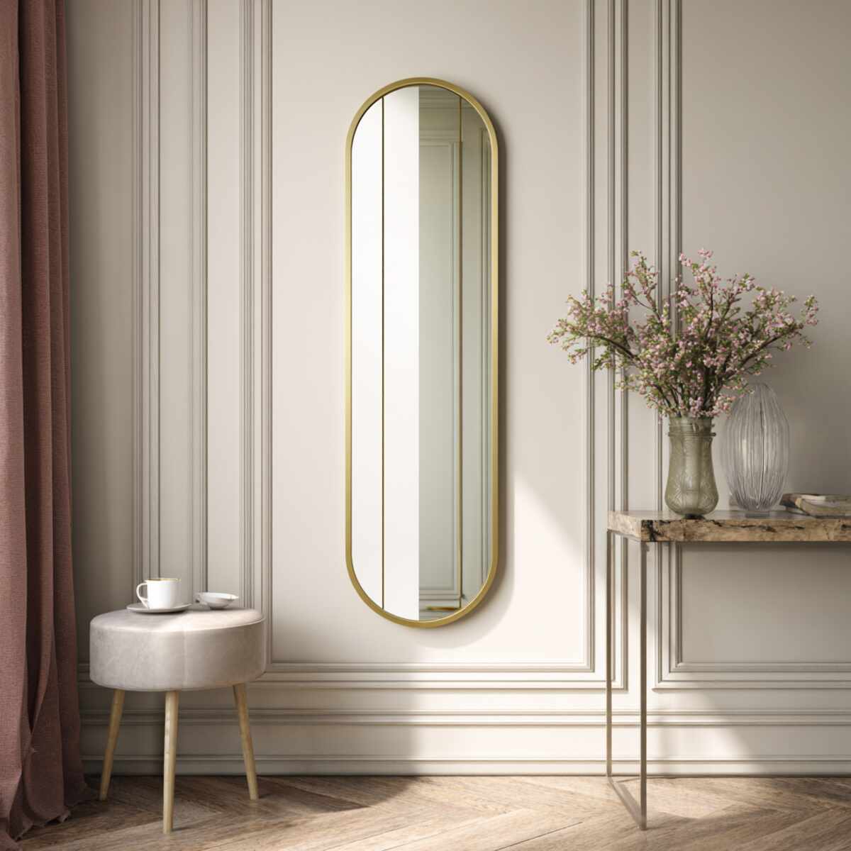 A vertical oval mirror introduces a smooth, curved look that breaks up the typical straight hallway edges. It fits easily on slim walls while making the area feel less cramped.