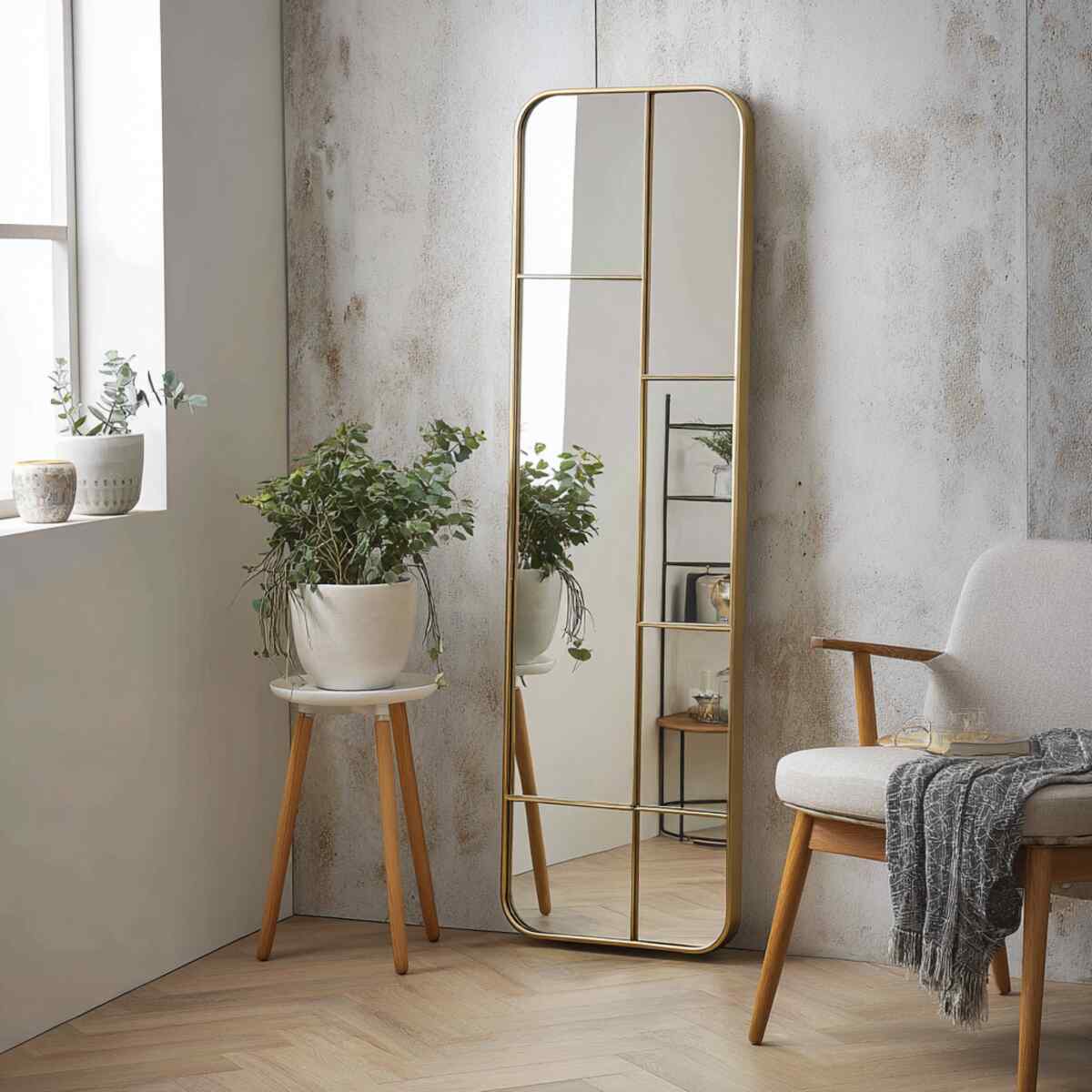 A slim gold mirror adds a touch of luxury while keeping the profile minimal. It reflects light beautifully and brightens even dim hallways.