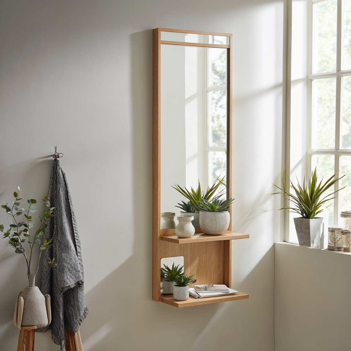 A mirror with a built-in shelf adds storage without taking up extra floor space.