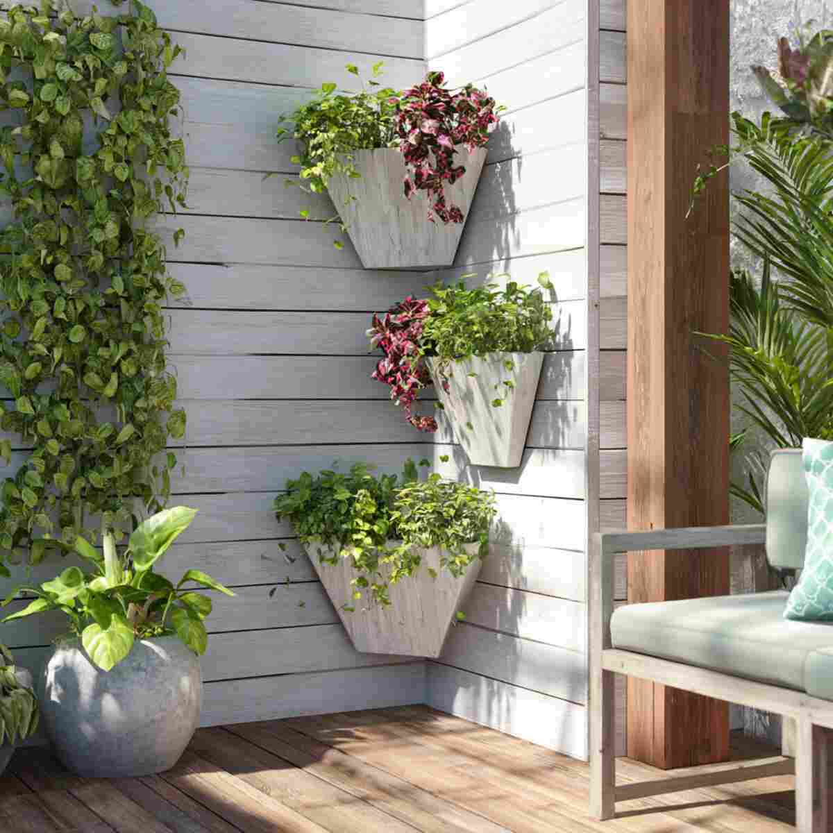 Corner wall-mounted planters are clever Outdoor Wall Planter Ideas that use often ignored spaces.