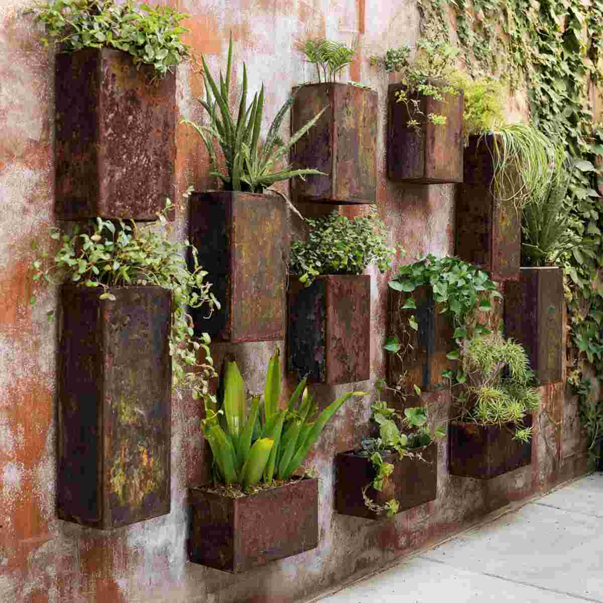 Rusted metal wall planters are bold Outdoor Wall Planter Ideas that add texture and character.