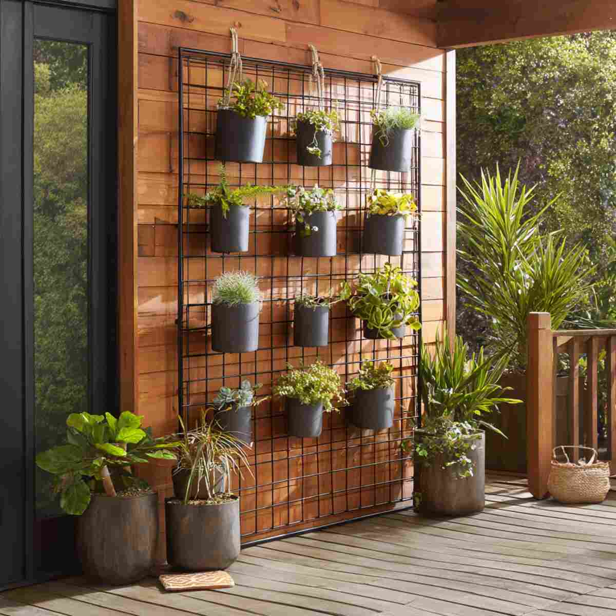 Metal grid walls paired with hanging planters are flexible Outdoor Wall Planter Ideas that allow easy rearrangement of plants.