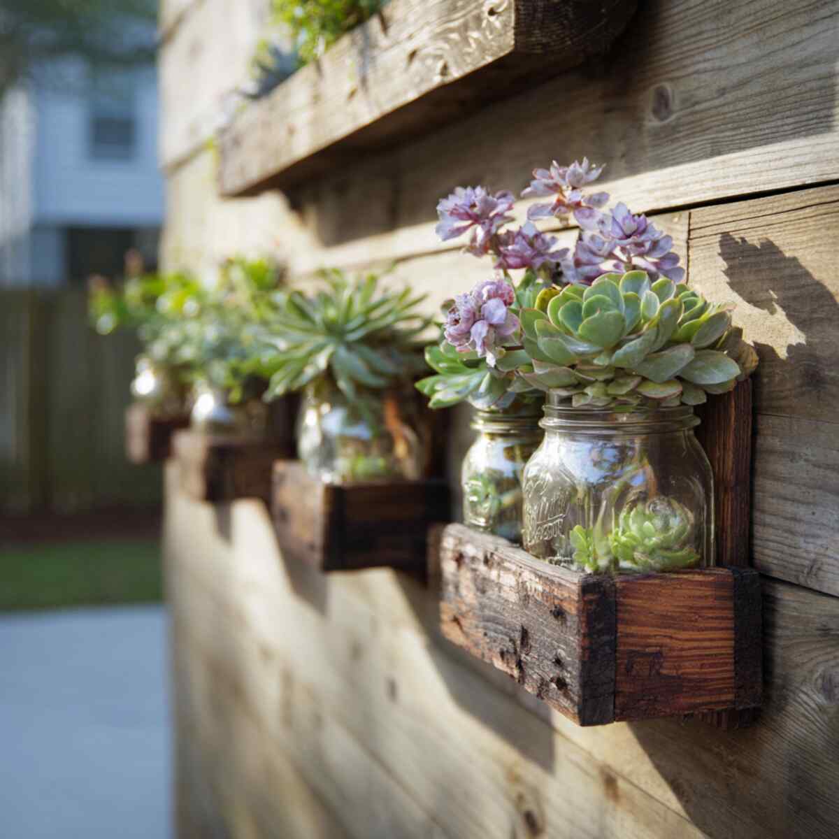 Mason jar wall planters are simple Outdoor Wall Planter Ideas that bring a cozy and handmade feel to outdoor walls.
