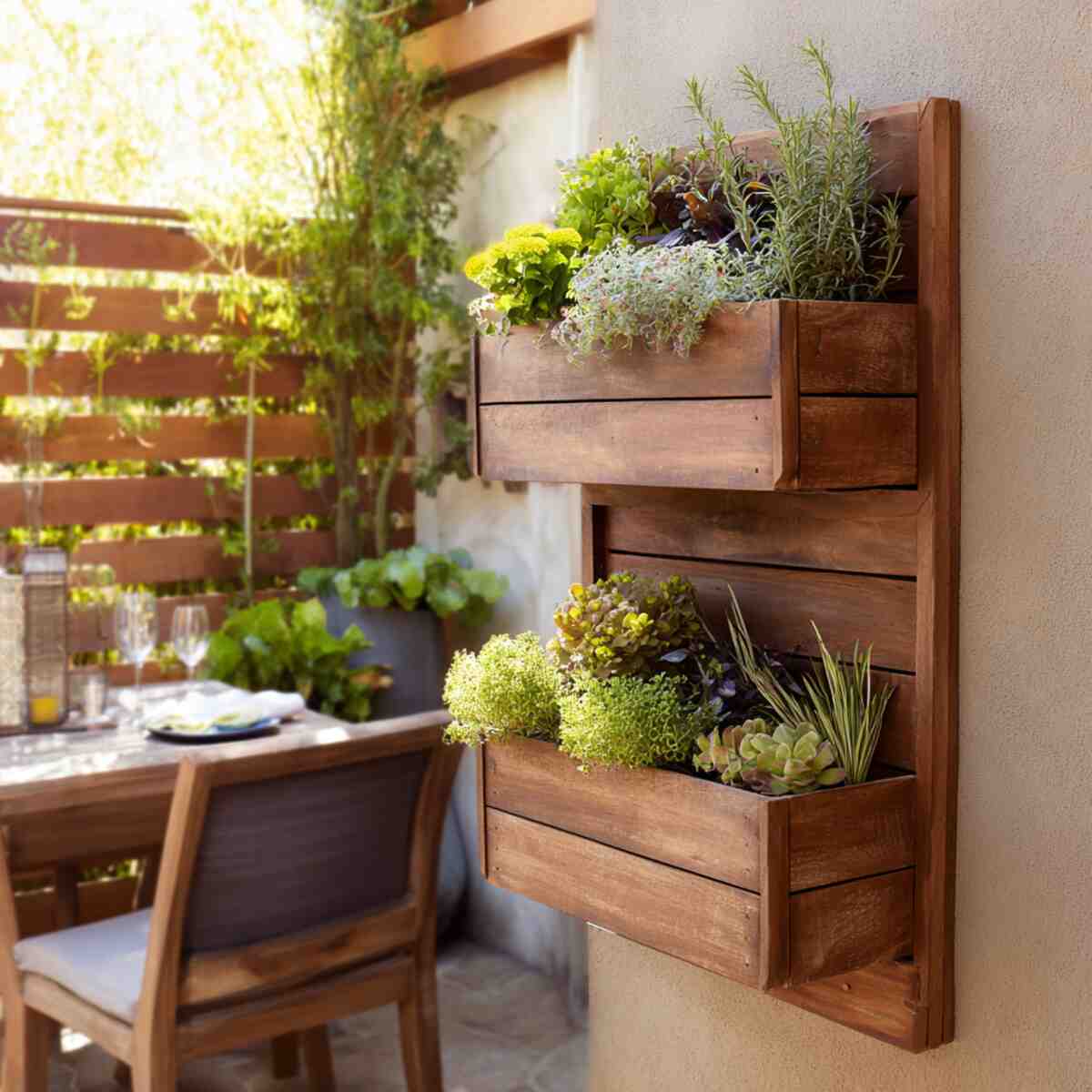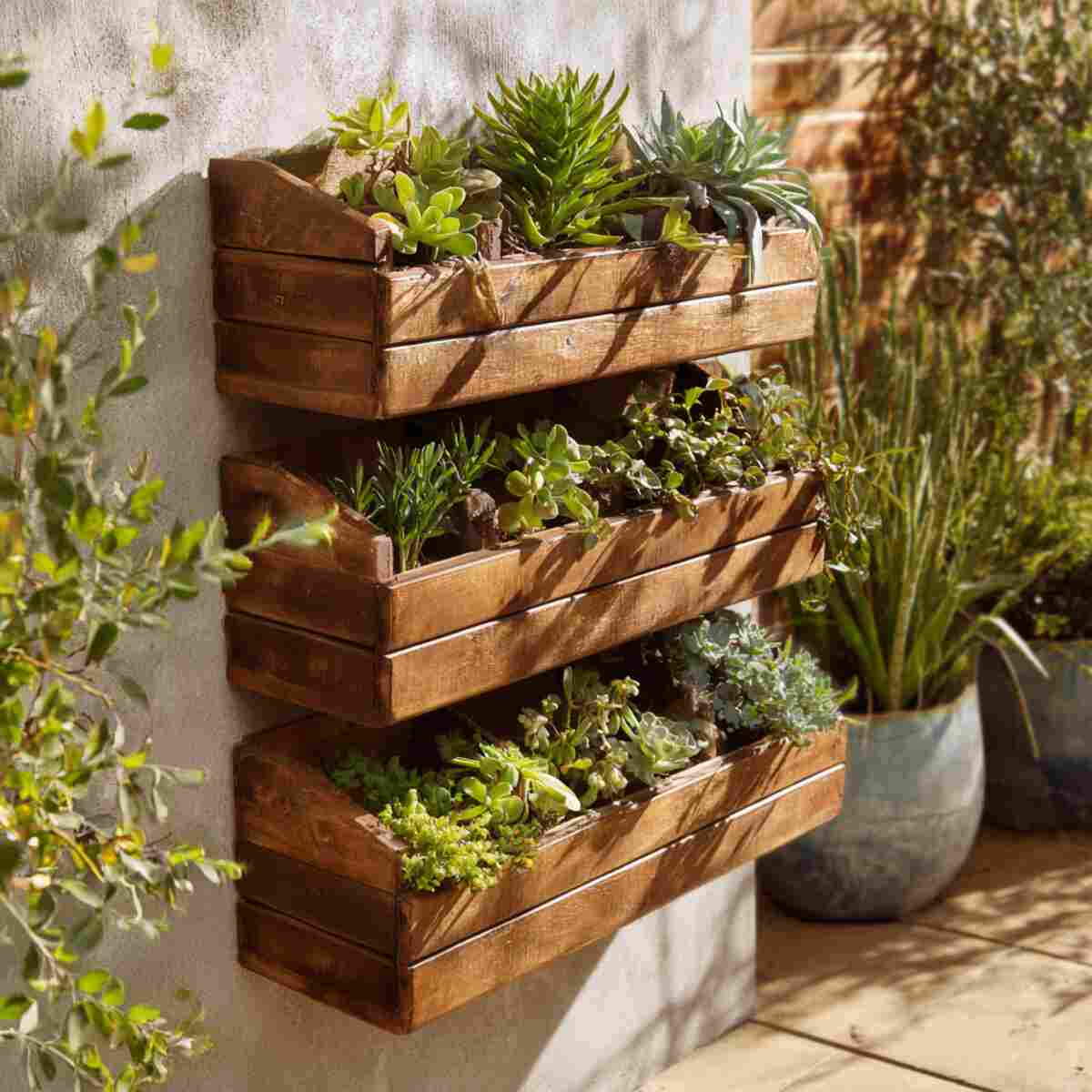 Tiered wooden wall planters are space-saving Outdoor Wall Planter Ideas that stack plants in an organized vertical layout.