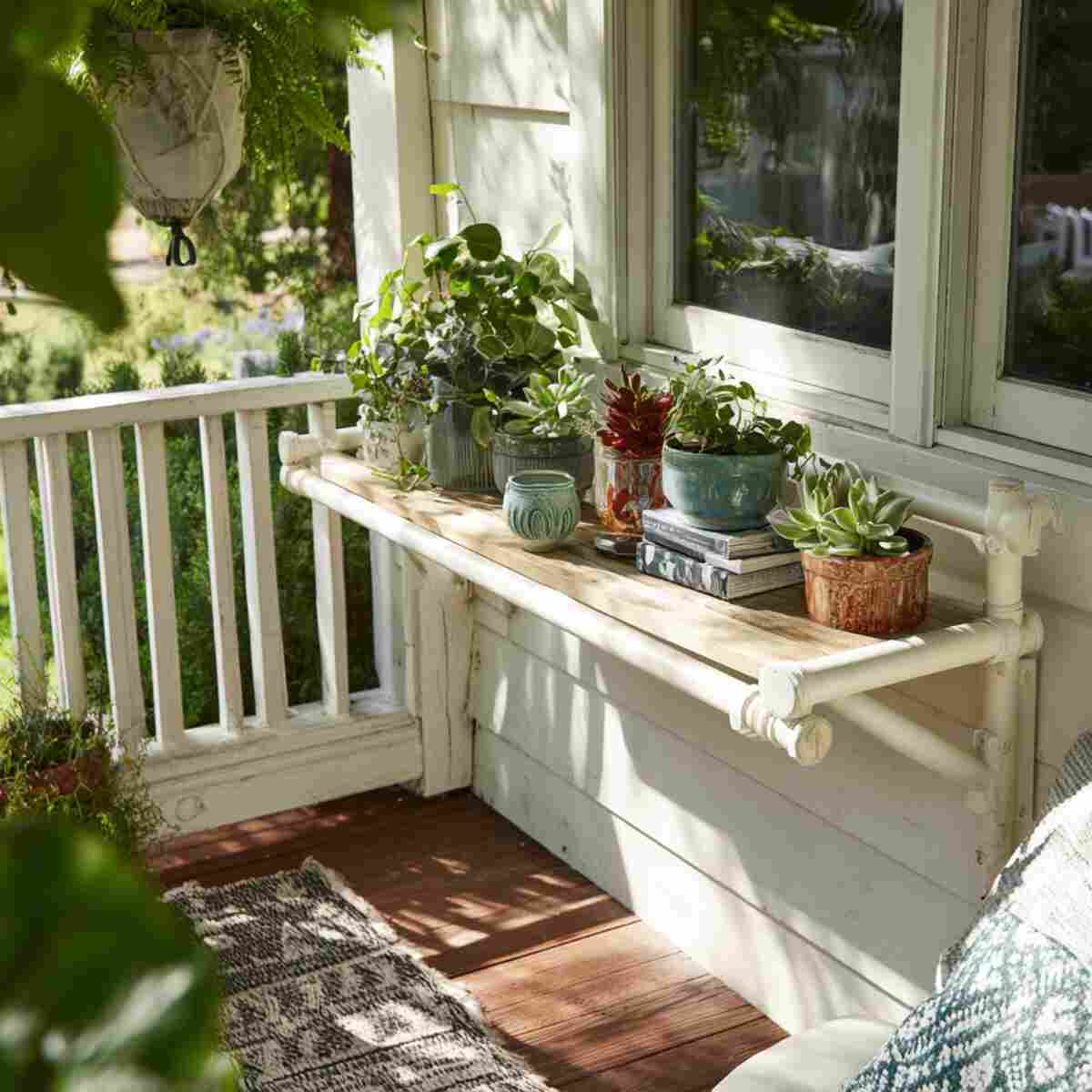 This shelf fits neatly into tight spots while providing extra room for plants or lanterns. It’s a great DIY Porch Railing Shelf Idea for maximizing small porches without cluttering the walkway.