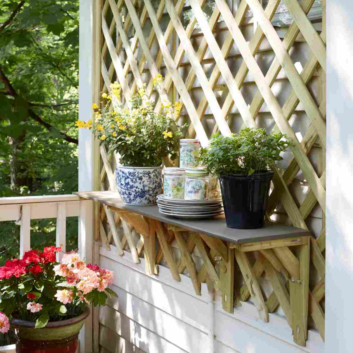 A lattice panel can serve as both decoration and structure for a porch shelf. You can attach small planks across the lattice to create multiple mini shelves.