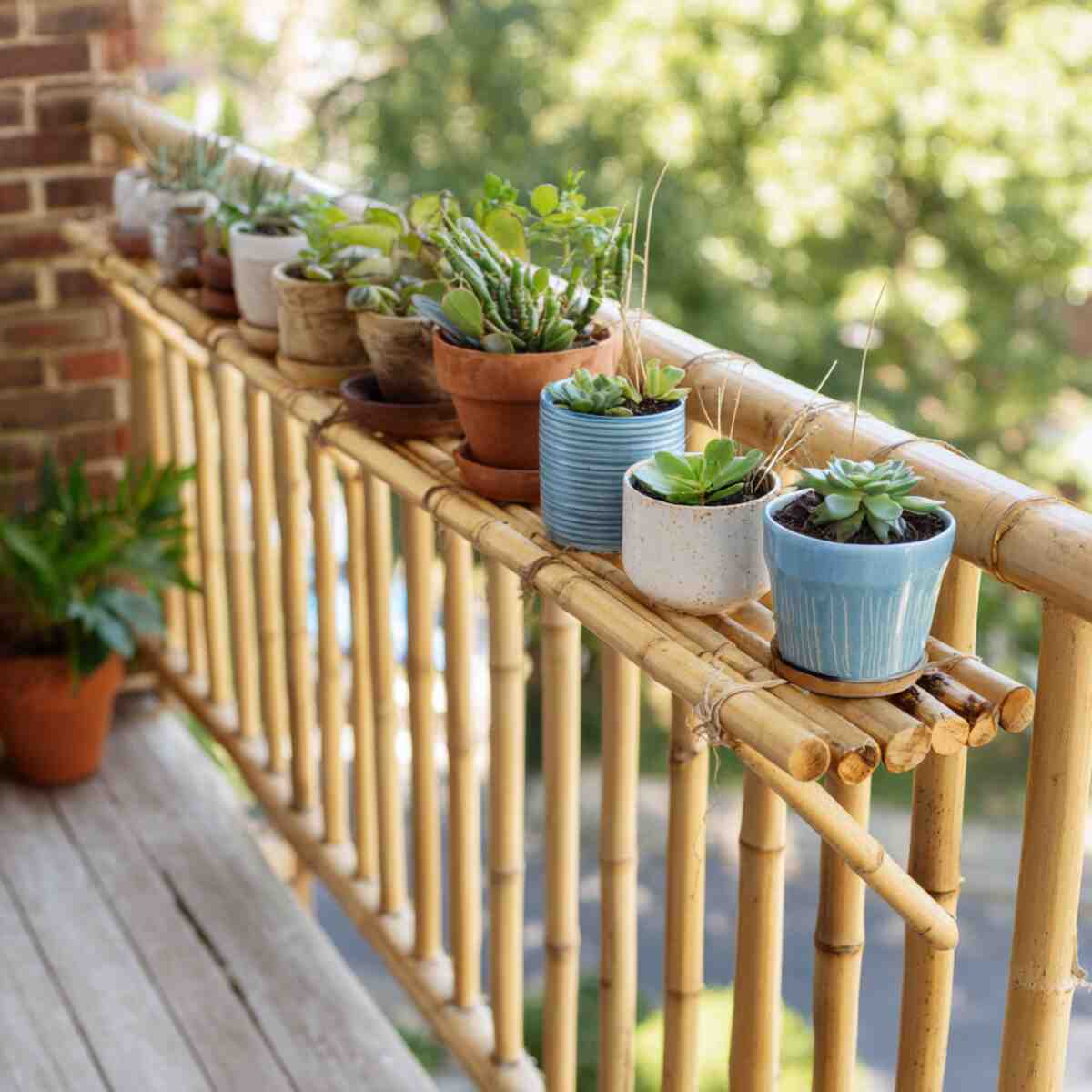 A bamboo railing shelf brings a tropical or eco-friendly vibe to your porch. It’s lightweight, water-resistant, and simple to build.