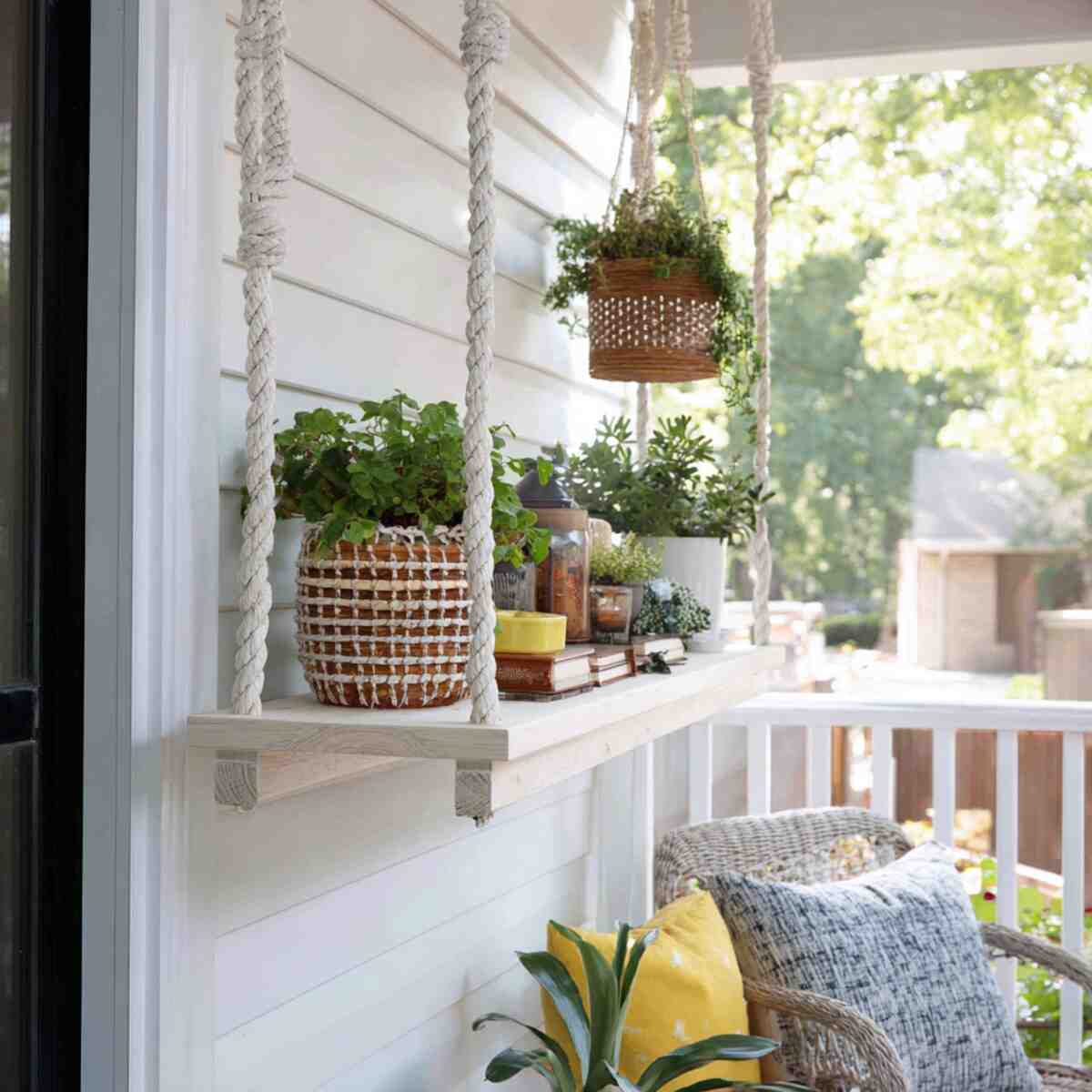 A hanging rope railing shelf adds a rustic, bohemian charm to your porch.