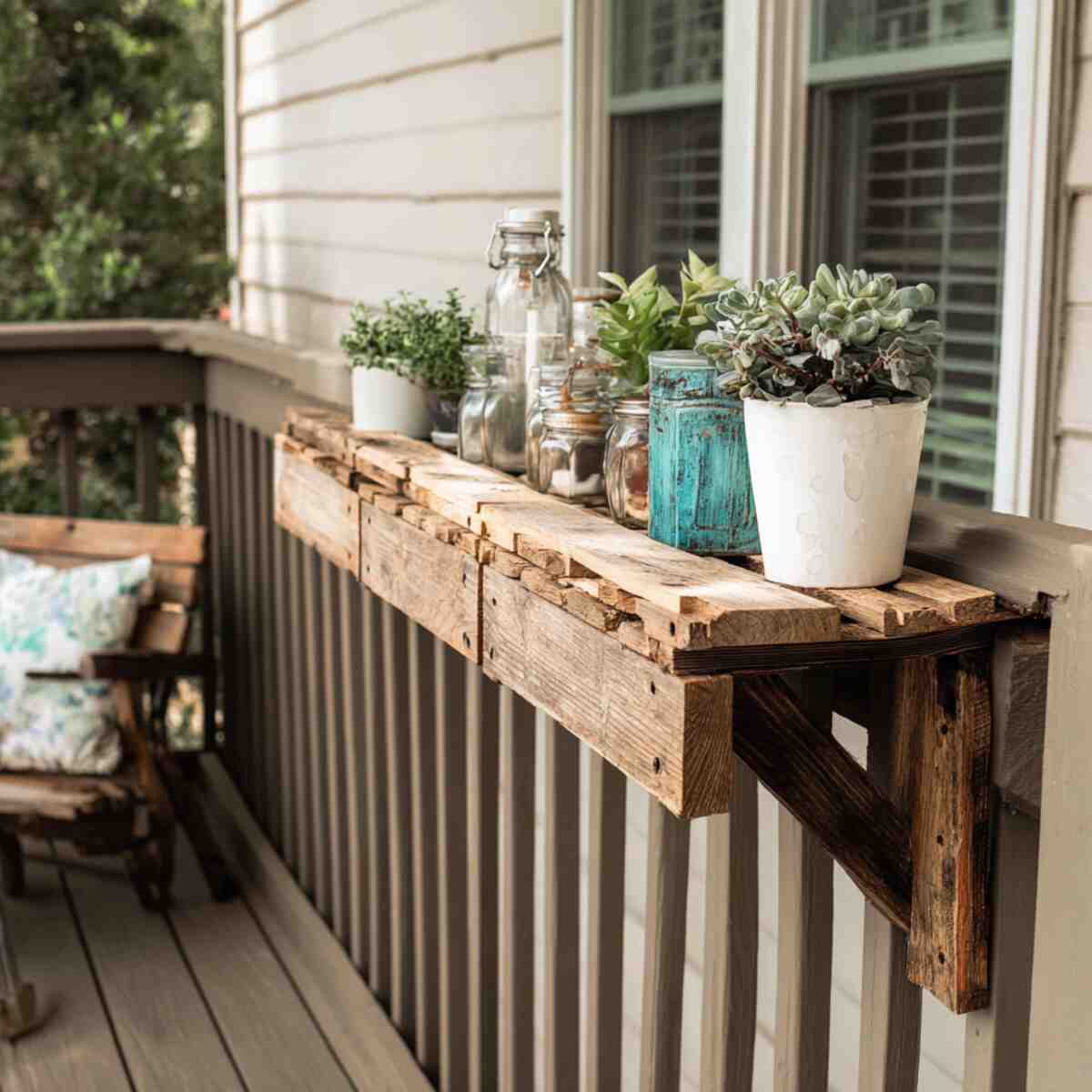 A pallet wood railing shelf is a sustainable and cost-effective option.