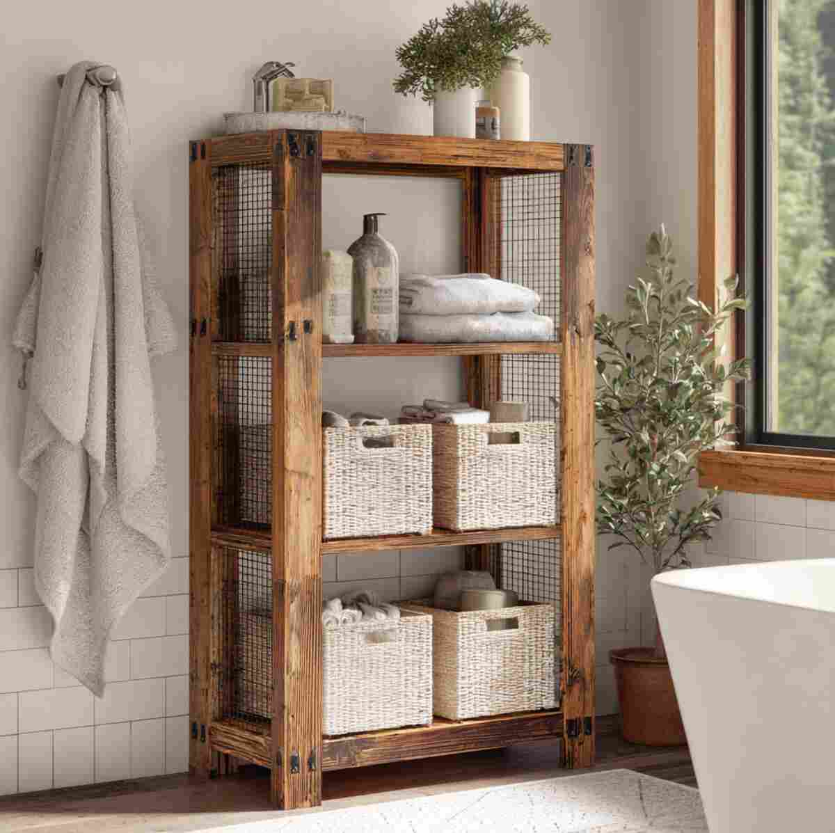 They let you showcase neatly folded towels, baskets, or vintage décor while maintaining a cozy wood tone. As a functional addition to your Rustic Bathroom Wood Accent Ideas, these cabinets make the bathroom look welcoming and organized.