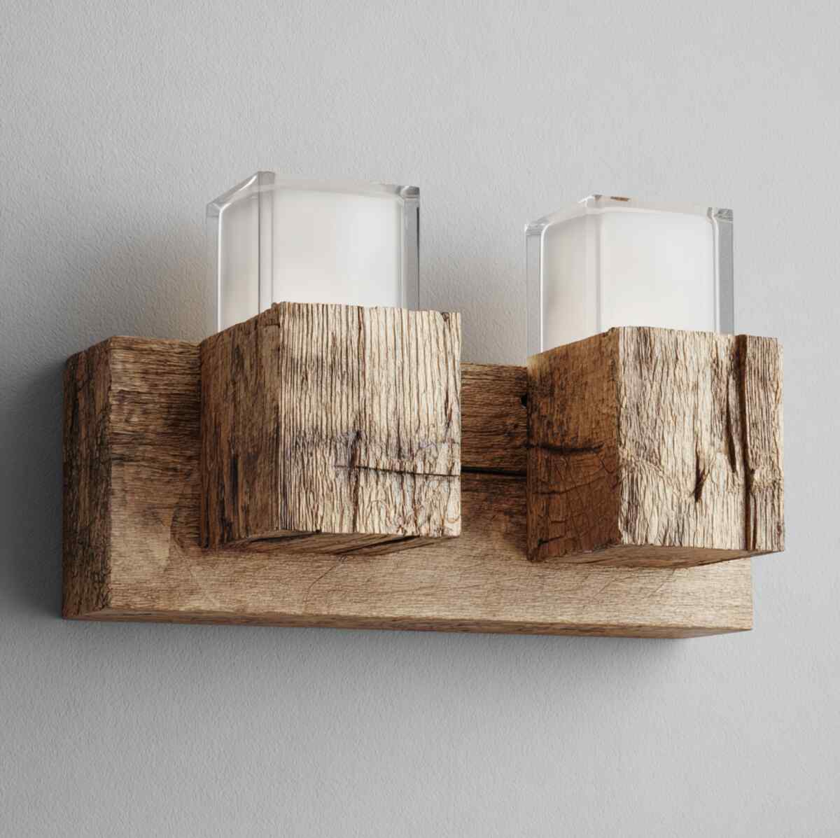 Wooden light fixture mounts or sconces bring soft lighting with a rustic twist. The natural wooden backing enhances the glow, creating a warm and intimate bathroom atmosphere.