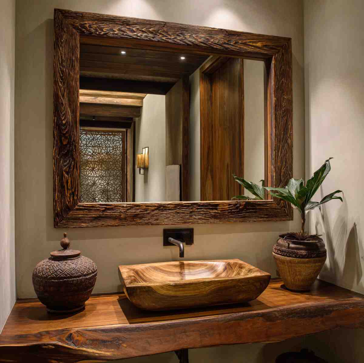 A wooden framed mirror acts as a simple yet powerful focal point in any rustic bathroom. Its earthy tones and natural texture soften the look of tiles and fixtures, adding a cozy cabin-like feel.