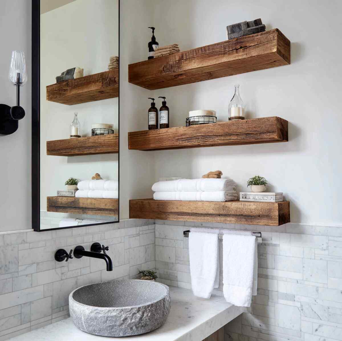 Floating wood shelves are a practical and decorative touch that fits perfectly into rustic design. They provide space for towels, plants, or candles while keeping a natural wooden theme.