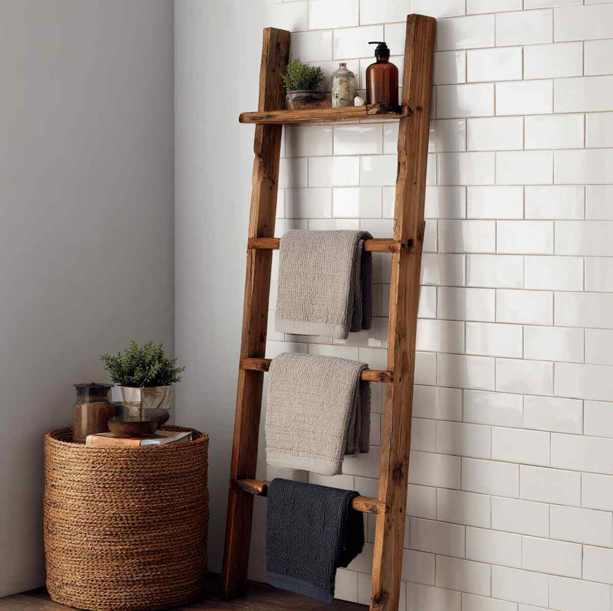 A rustic wood towel ladder combines simplicity with style, offering an alternative to metal racks.