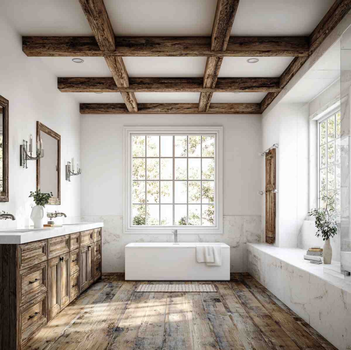 Distressed wood ceiling beams add depth and dimension to the bathroom’s design.
