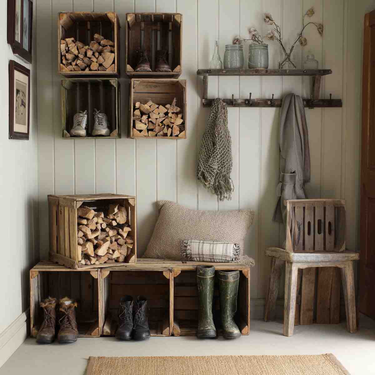 Including crates in your Rustic Entryway Decor Ideas is a clever way to blend practicality with vintage-inspired design.