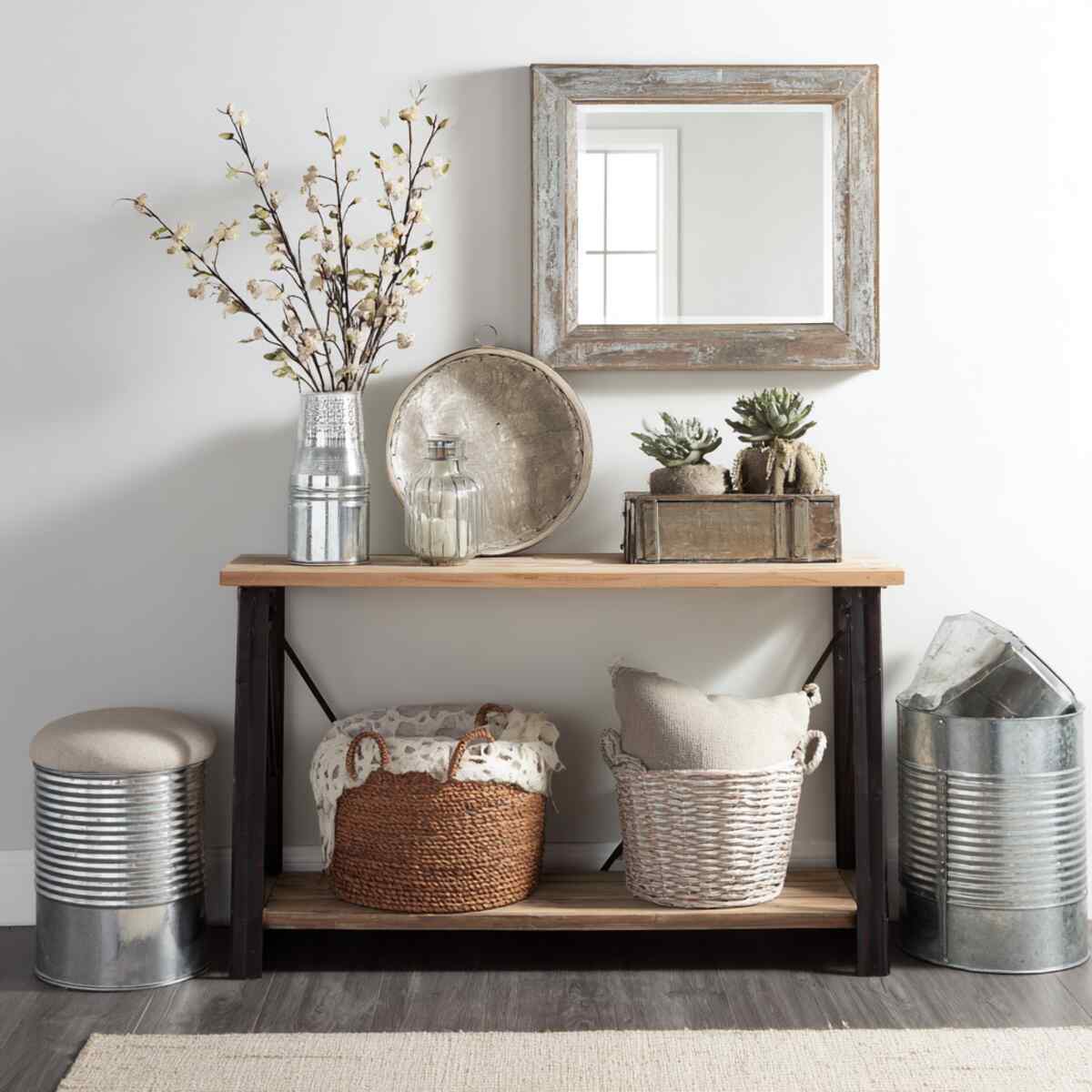 Galvanized metal accents, like trays, buckets, or wall hooks, add an industrial edge to rustic entryways. Their weathered, silver-gray finish pairs perfectly with wood and natural materials.