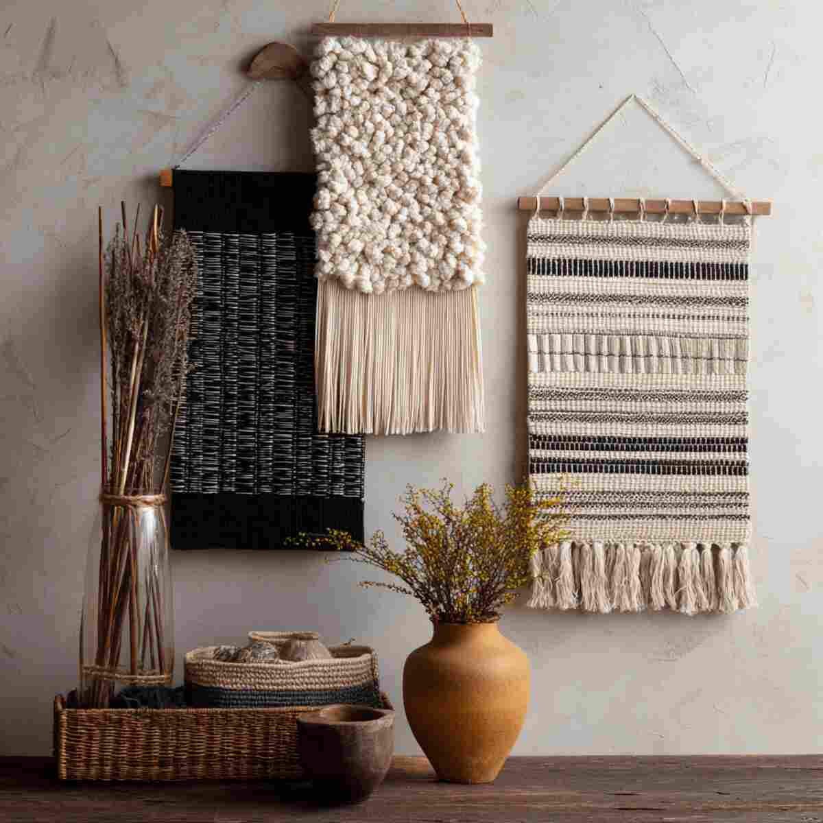 Woven wall hangings introduce softness and artisanal texture to your entryway walls.