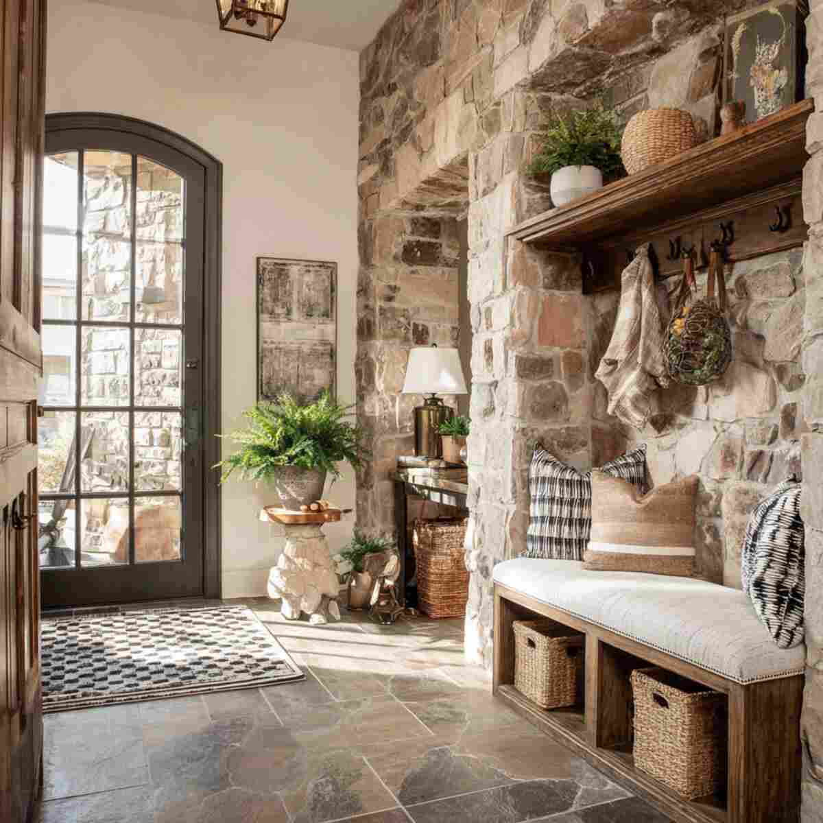 A natural stone or brick accent wall creates a strong rustic statement in your entryway.