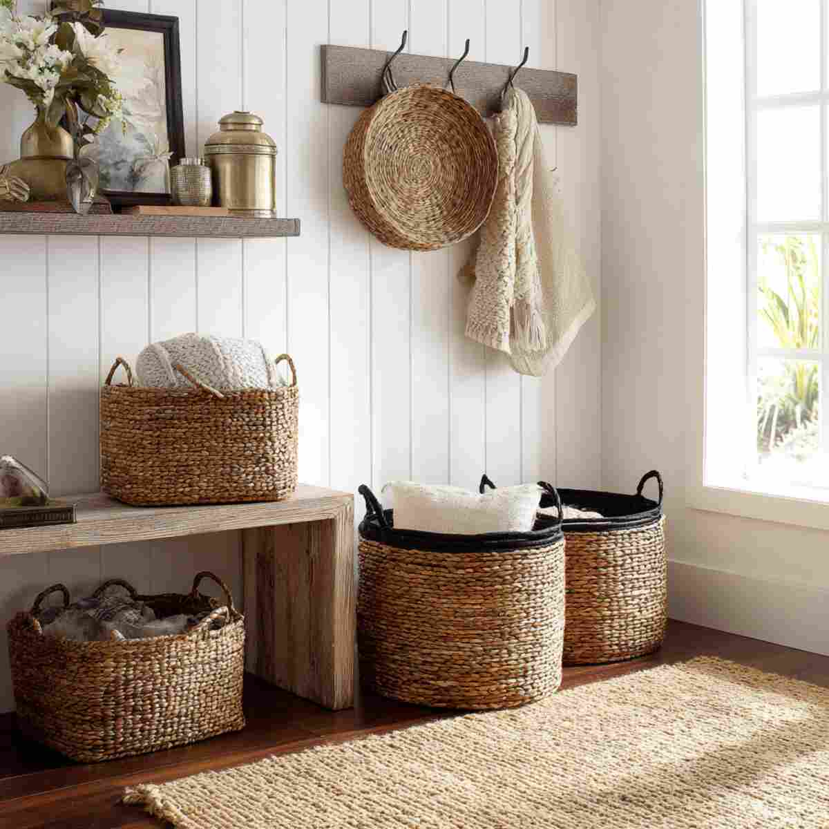 Woven baskets are versatile storage solutions that complement rustic interiors. They can hold shoes, scarves, or miscellaneous items, keeping your entryway tidy.