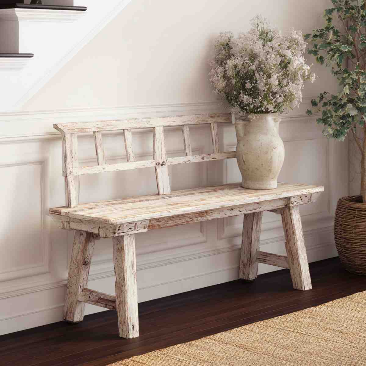 A distressed wooden bench adds both seating and rustic charm to your entryway. Its weathered look emphasizes the cozy, lived-in feel that defines rustic decor.