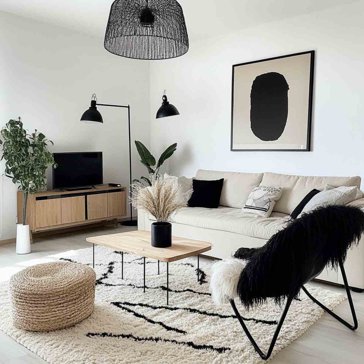 Adding black accents creates contrast and depth in a Scandinavian living room.