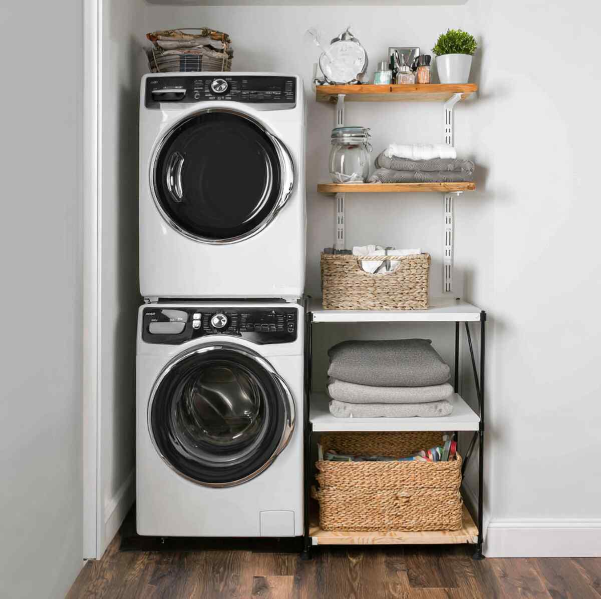 1. Stackable Washer and Dryer with Wall-Mounted Shelves