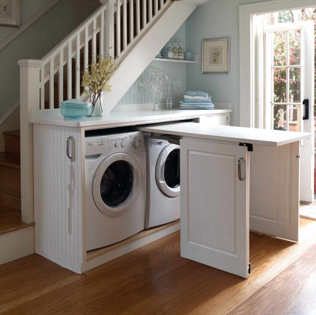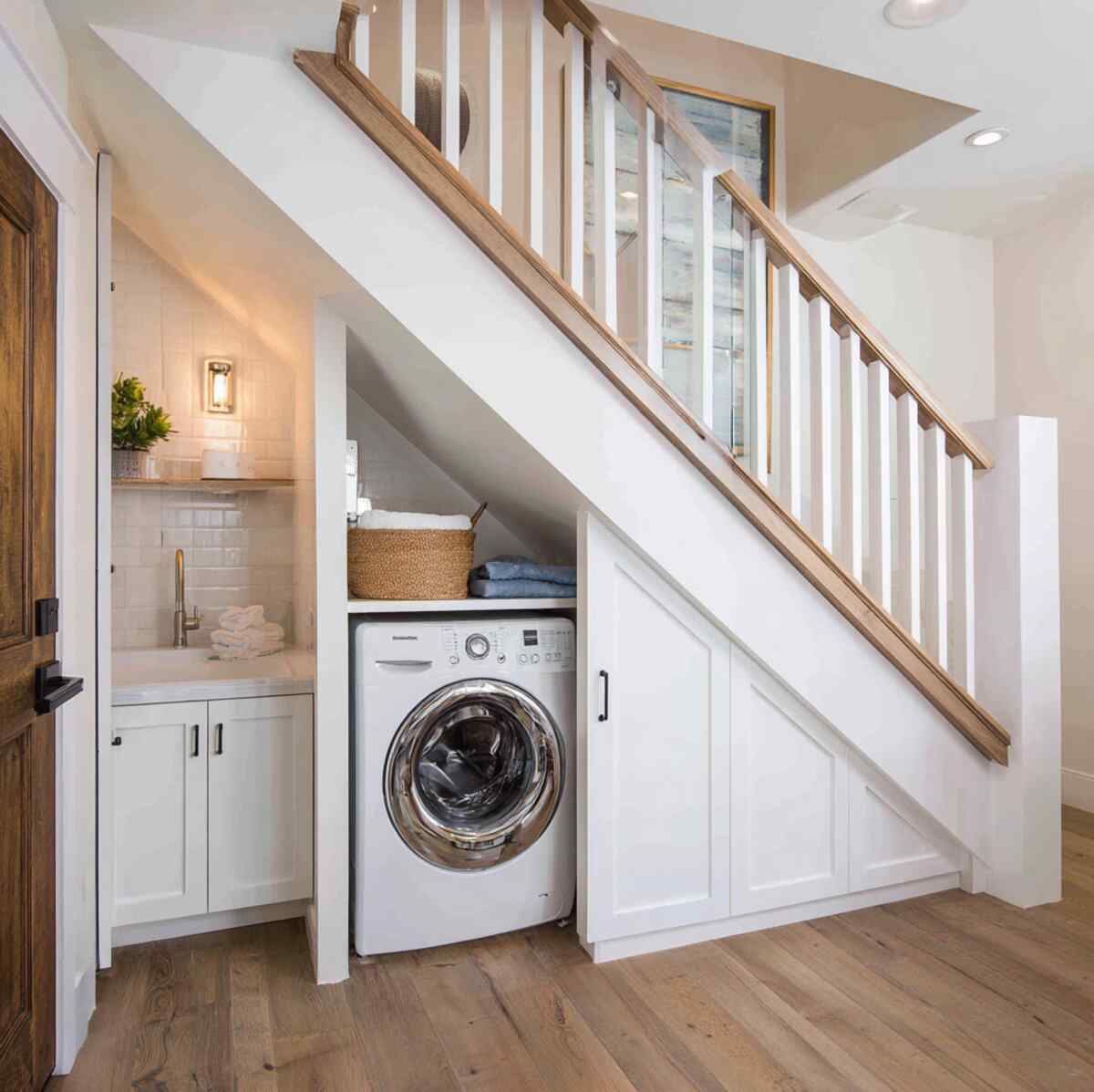 Utilizing the space under the stairs for a laundry closet is one of the smartest small basement laundry combo ideas.