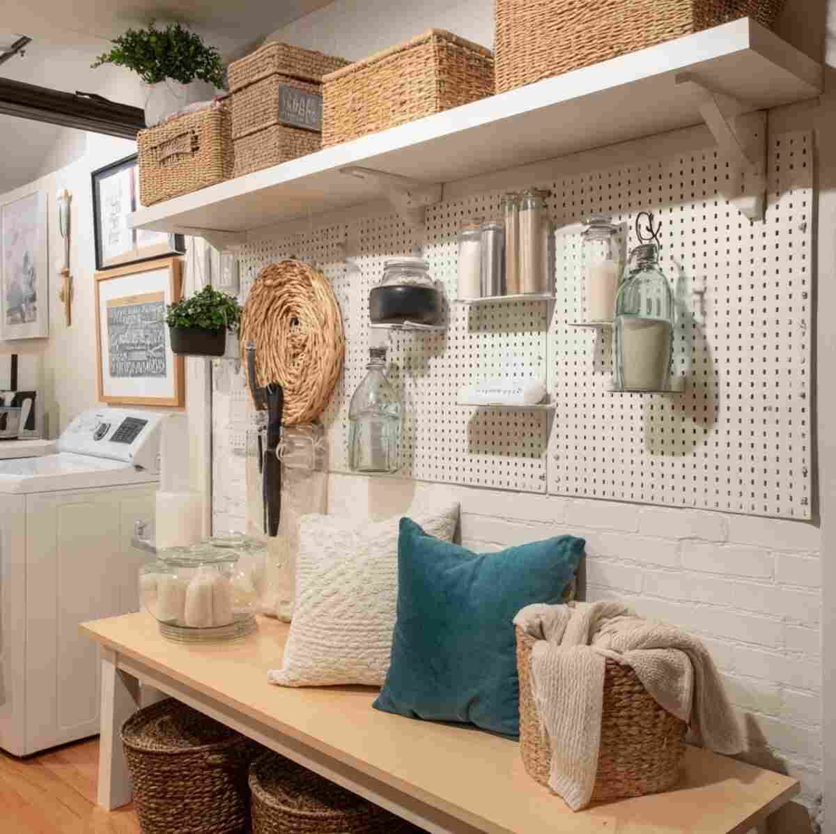 Installing a pegboard in a laundry corner is one of the most organized small basement laundry combo ideas.