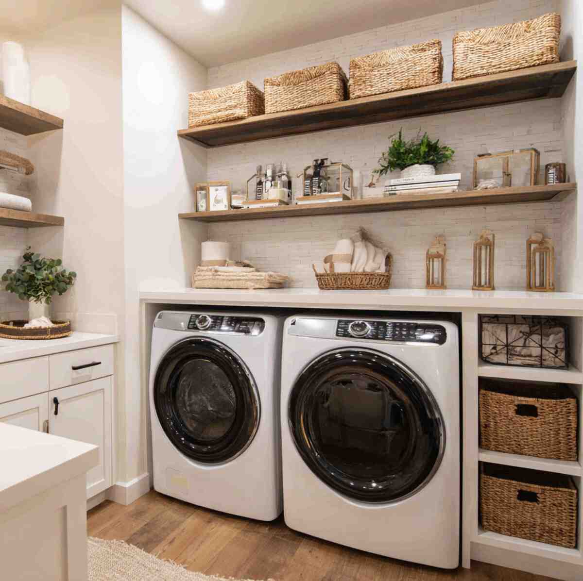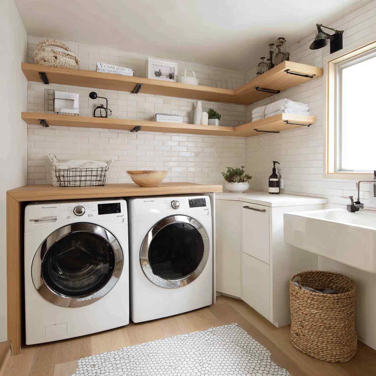 Open shelving above your machines is a simple and effective option in small basement laundry combo ideas.