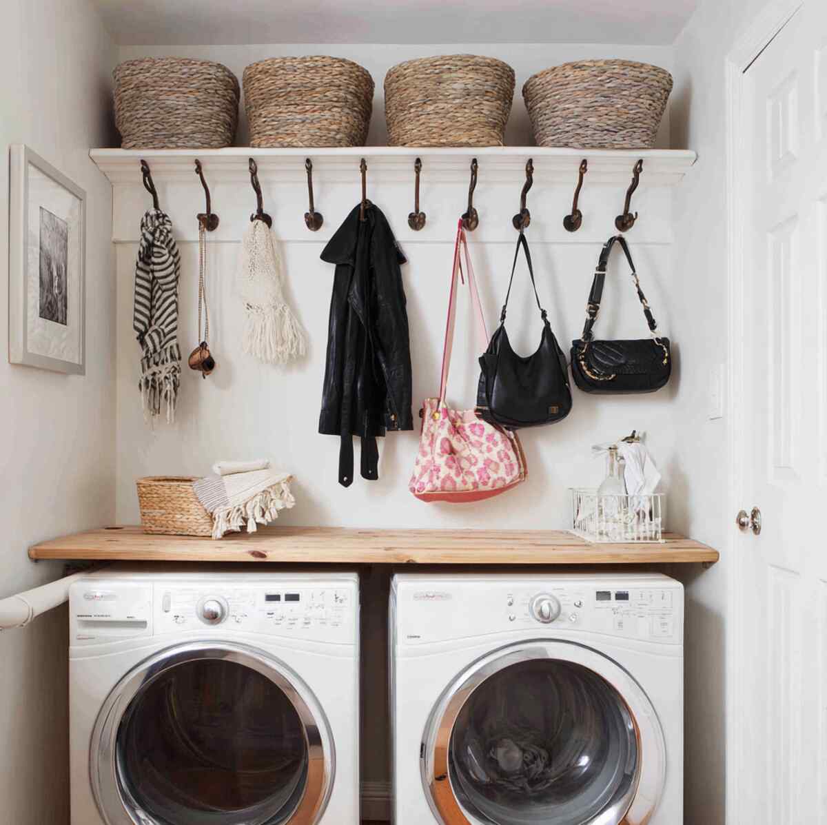 Adding hooks for coats, bags, and laundry bags enhances small basement laundry combo ideas. This dual-purpose setup allows you to organize personal items and laundry in the same space.