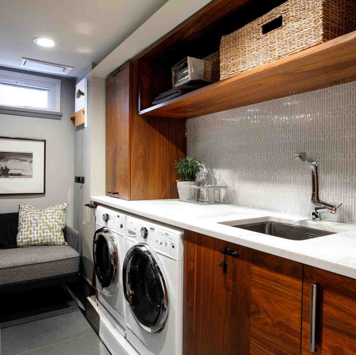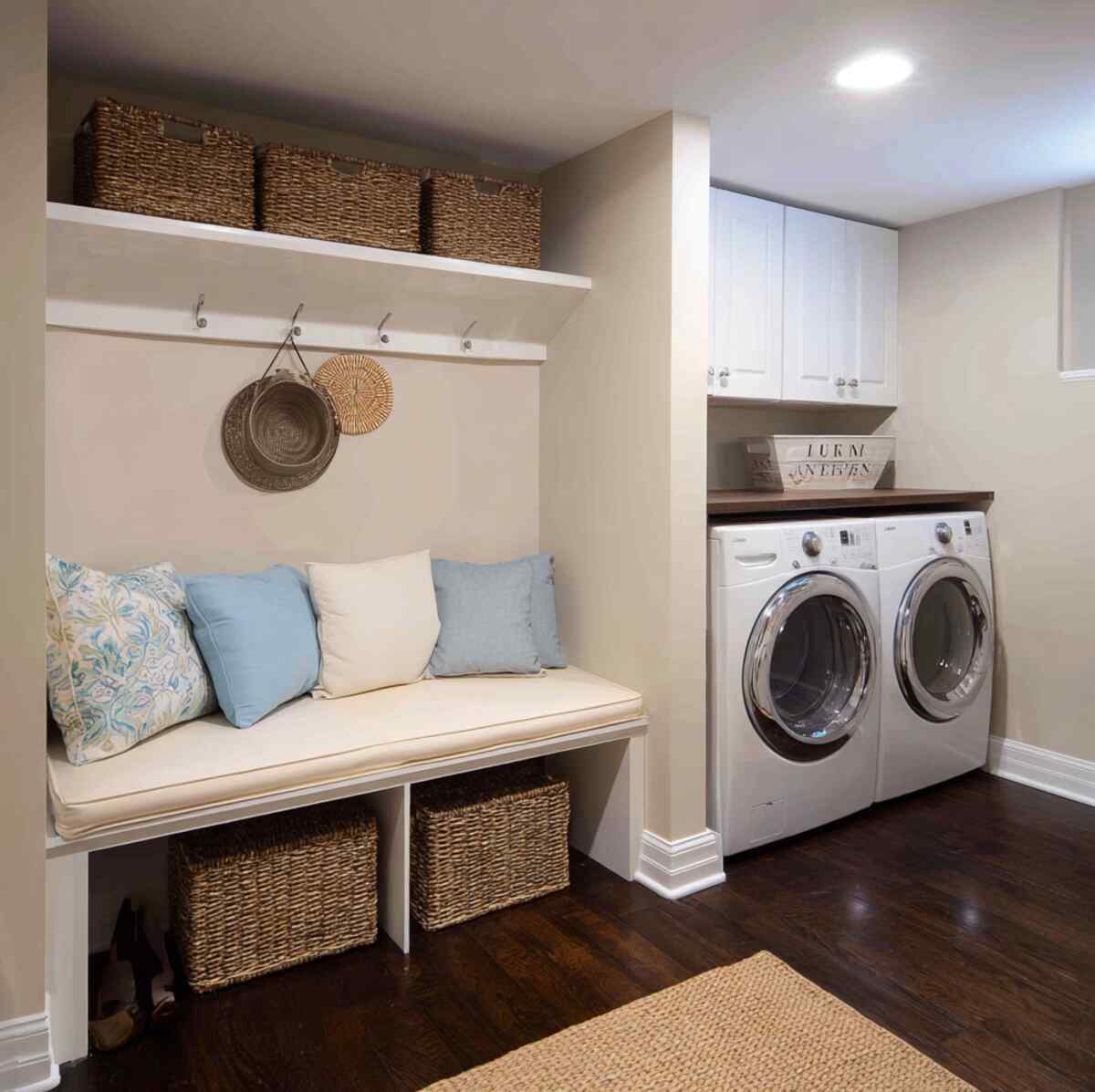 Combining a mudroom and laundry area is one of the most practical small basement laundry combo ideas. It allows you to manage dirty clothes and outdoor gear in a single space.