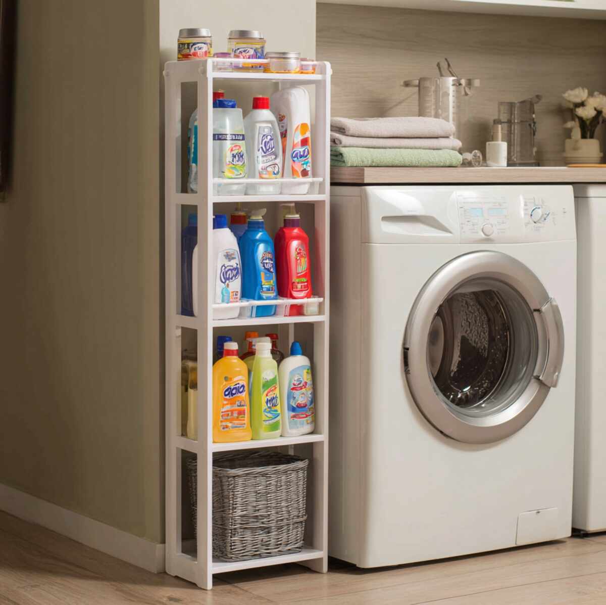 A slim vertical storage tower maximizes space efficiency in small basement laundry combo ideas. It provides multiple shelves for detergents, fabric softeners, and cleaning supplies without taking up floor area.
