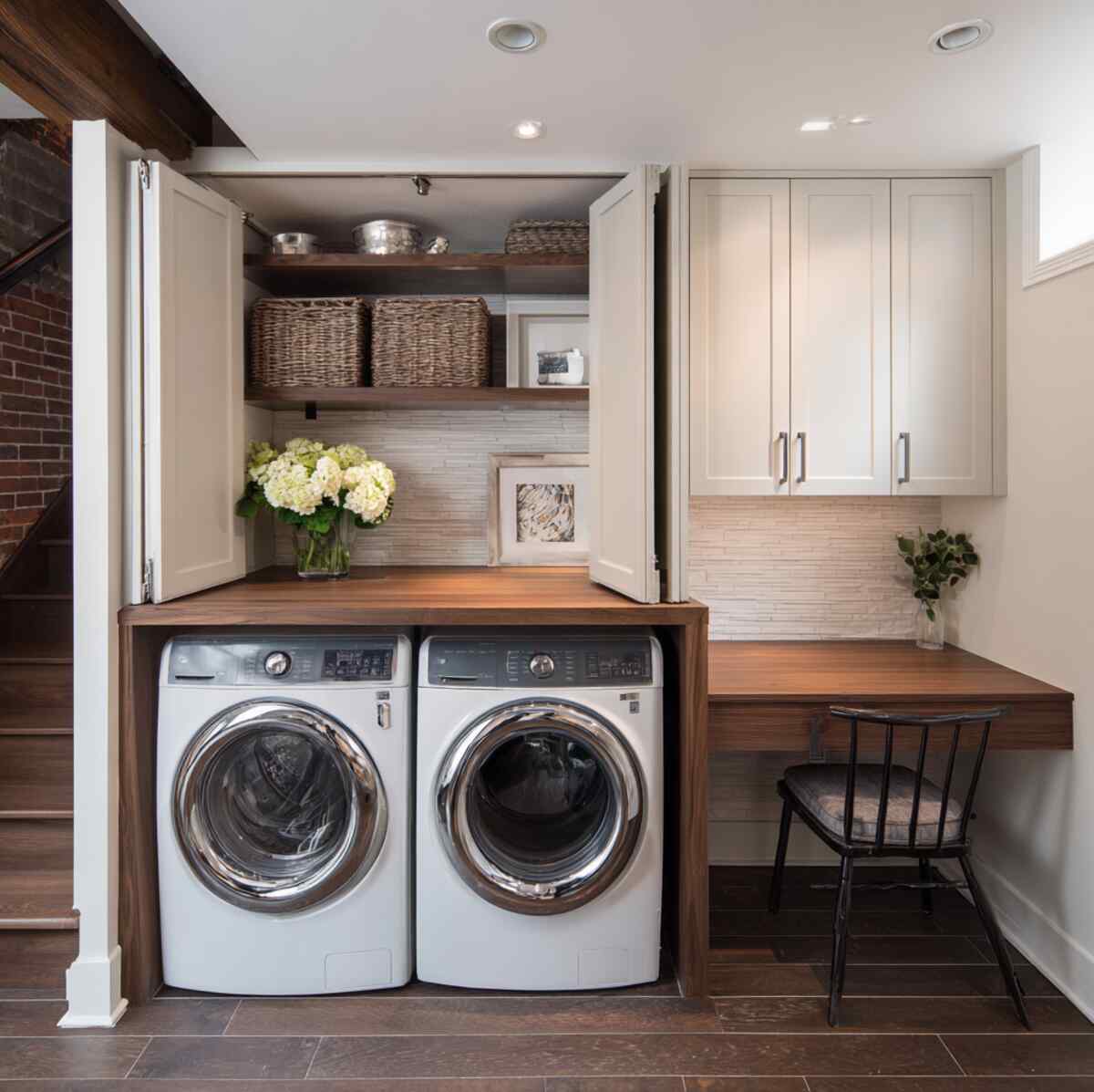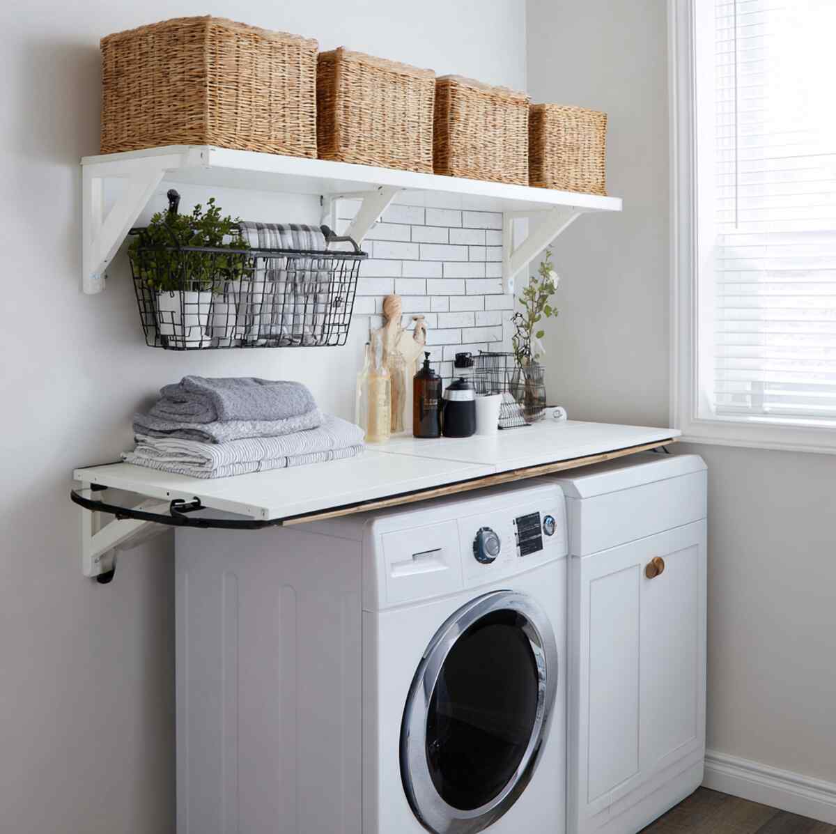 A folding wall-mounted laundry table is ideal for small basement laundry combo ideas because it can be tucked away when not in use.